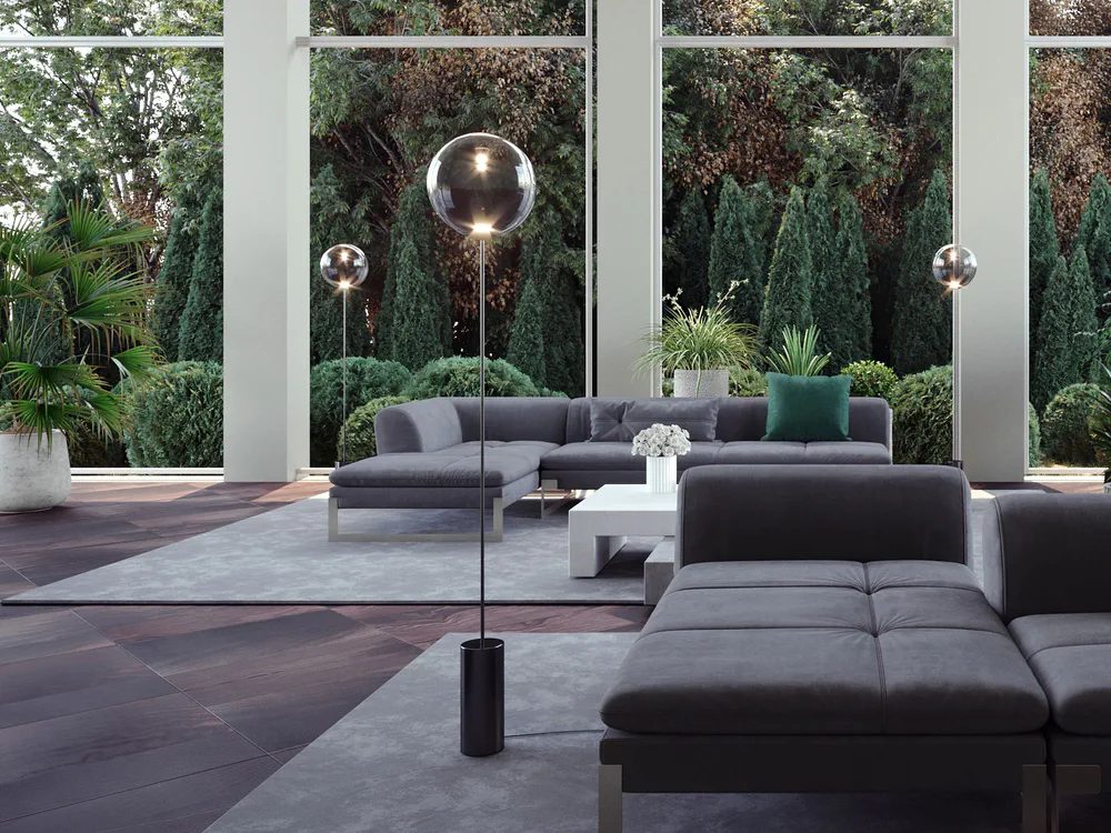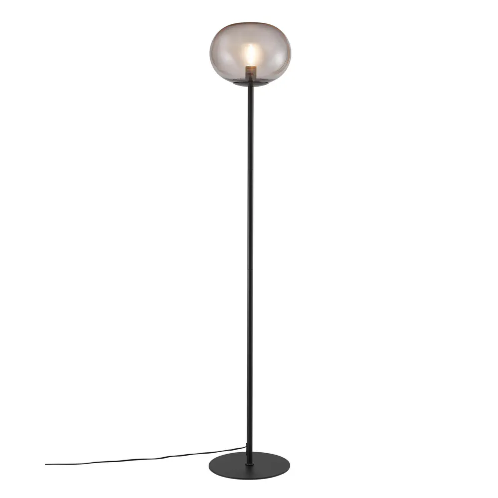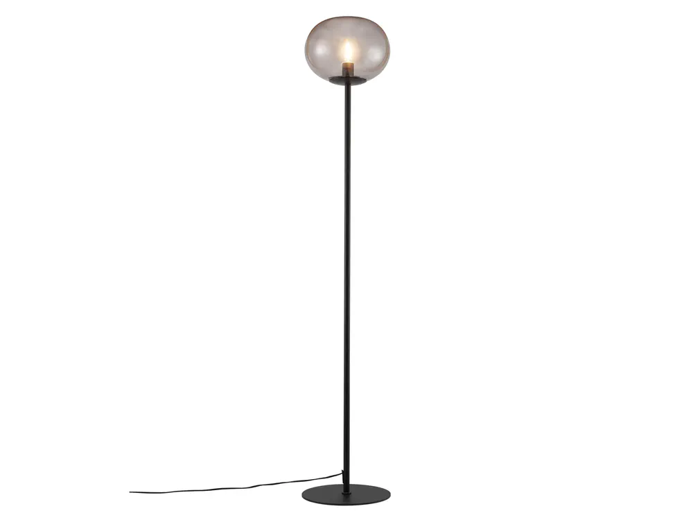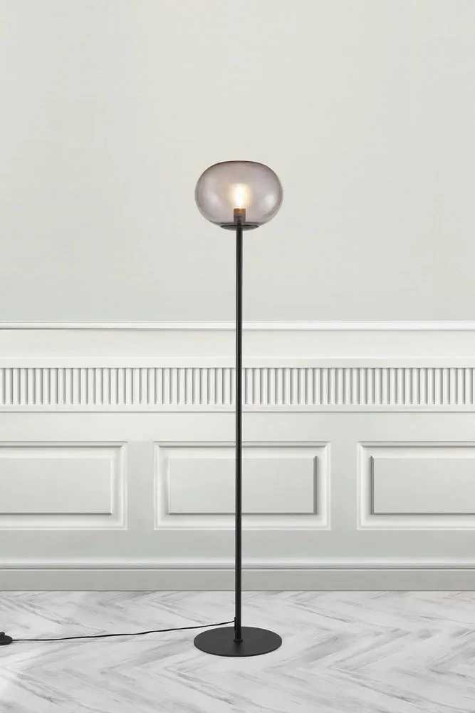 Elevate your home decor with the ALTON LED handmade blown glass floor lamp. Crafted from unique smoked glass and matte black metal, this lamp is not just a light source, but a striking art piece that enhances any room. Its individual craftsmanship means each piece is truly one-of-a-kind, featuring charming air bubbles and varying thicknesses that give it character. Enjoy a cozy environment with its soft and glare-free light. Perfect for displaying with a decorative bulb, the ALTON lamp harmonizes elegance and warmth, making it a must-have for contemporary interiors.