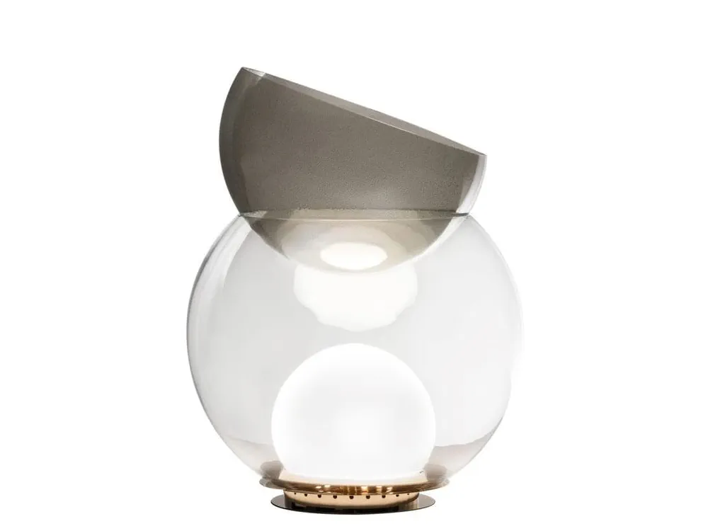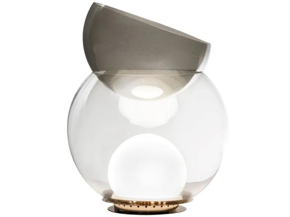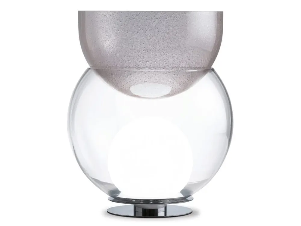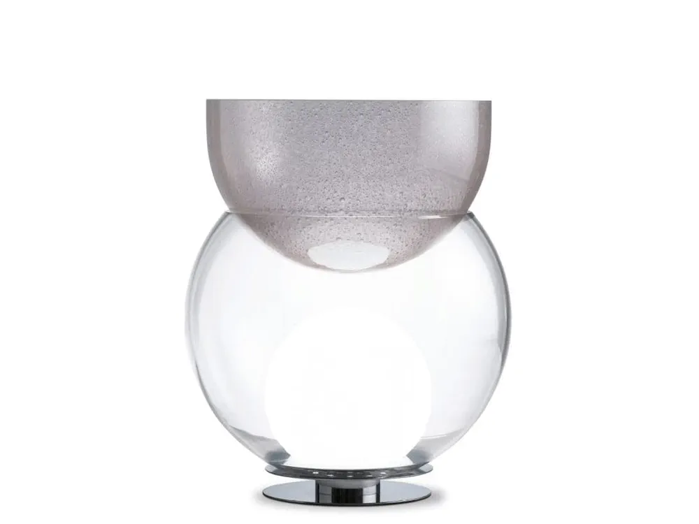 Introducing GIOVA, a stunning blend of art and function designed by Gae Aulenti. This unique table lamp doubles as a luminous sculpture, featuring a striking transparent bowl and a decorative upper vase made of blown pulegoso glass. Its diffused light creates a warm ambiance, while the galvanized metal base ensures durability. Perfect for elevating your decor in any contemporary setting, GIOVA is a captivating addition that will impress your guests and brighten your space.
