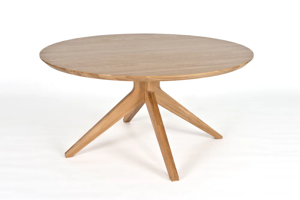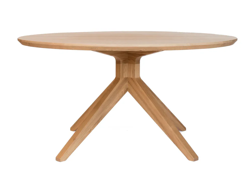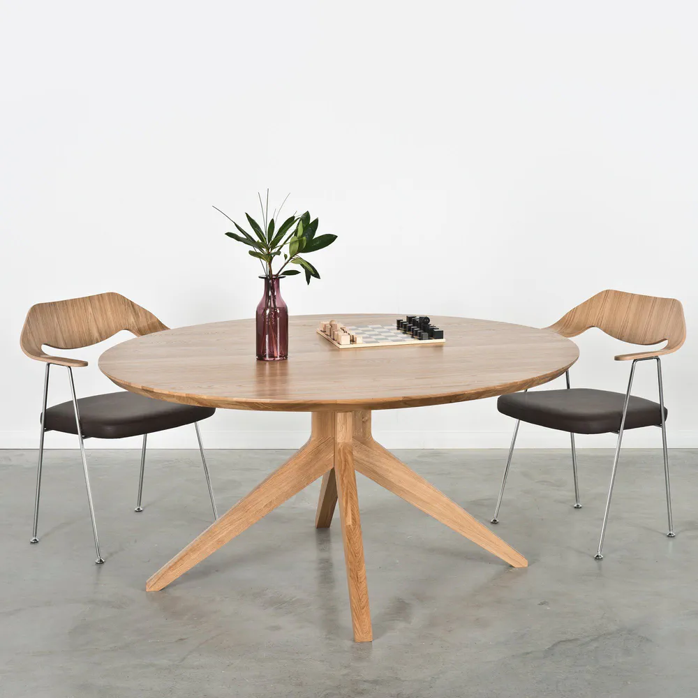 Elevate your dining experiences with the Cross round dining table, designed by Matthew Hilton. This stunning table comfortably seats up to 8 people around its impressive 1.5m (59”) solid wood top. Its contemporary design features chamfered edges and a central pedestal base, positioning it as the perfect centerpiece for gatherings. Crafted meticulously from solid oak and walnut with a clear polyurethane lacquer finish, this table combines practicality with style. Suitable for both home and contracts use, partial assembly is required, making it a versatile addition to any dining room.