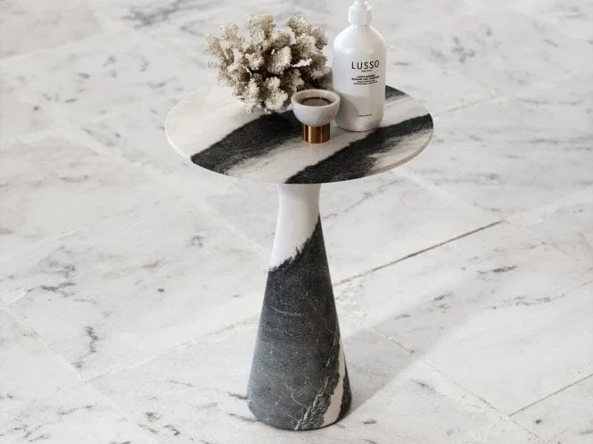 The Monet marble coffee table is an exquisite, polished round table featuring an hourglass body, perfect for any room in your home. Crafted from high-quality Panda marble, this unique piece showcases stunning veining that guarantees no two tables are identical. Hand-finished with care, it serves as a functional coffee table, bedside table, or decorative element, elevating your space's aesthetic. Enjoy peace of mind with a lifetime guarantee on this elegant addition to your furniture collection.
