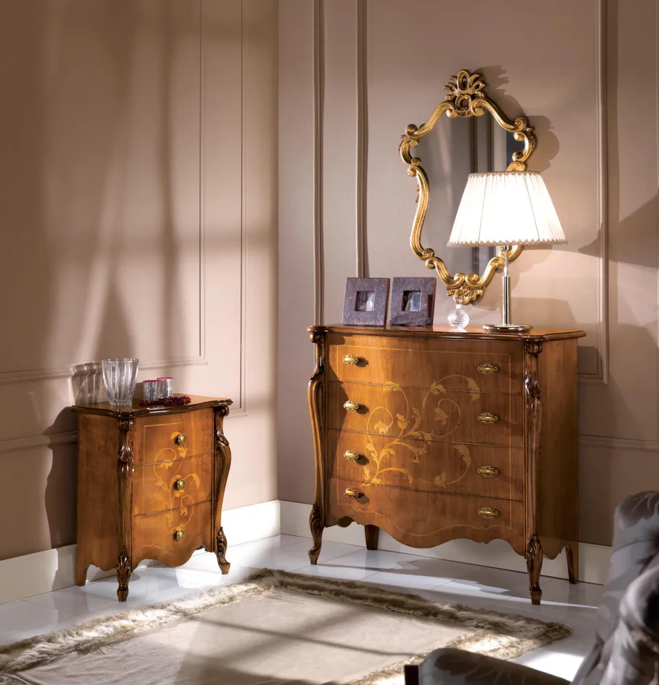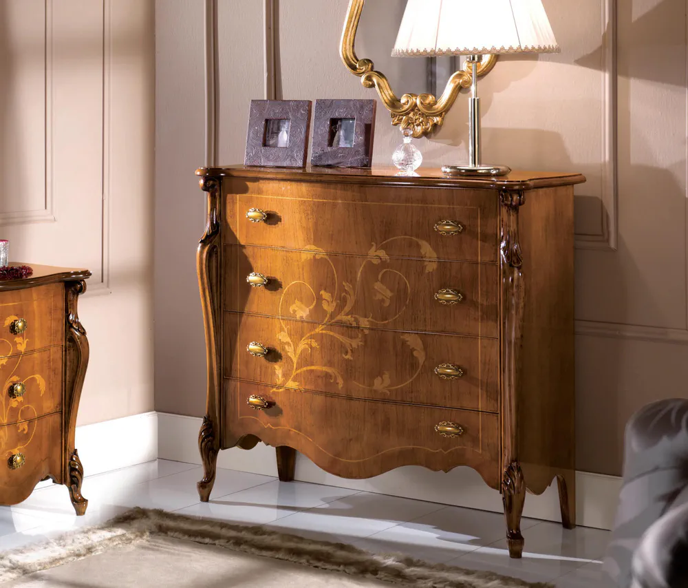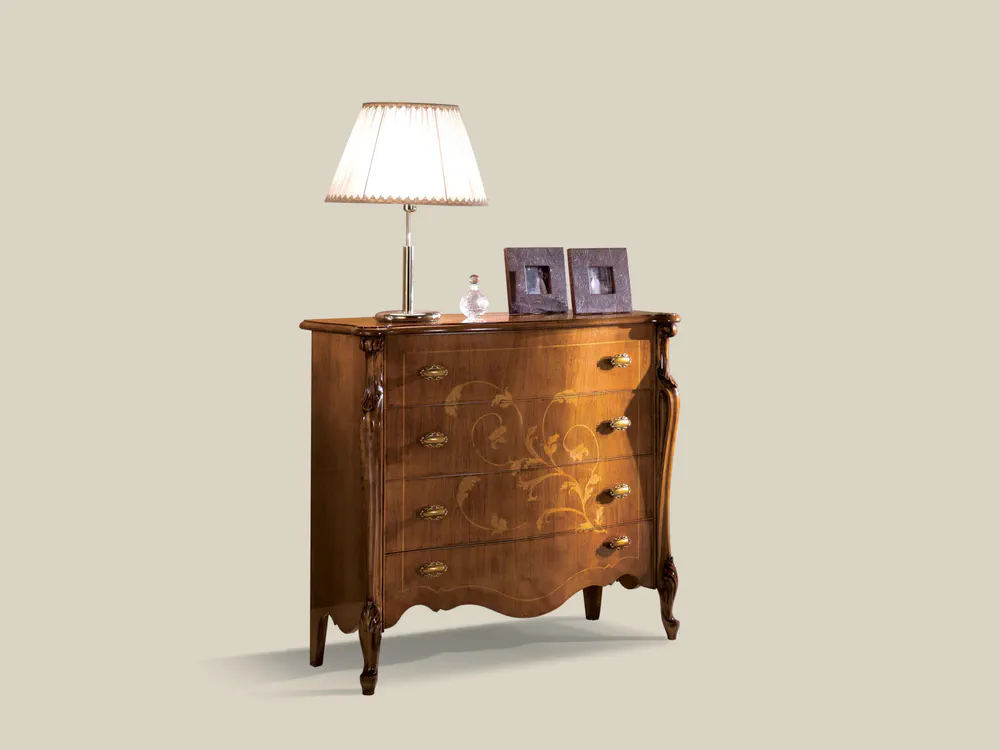 Elevate your home decor with the exquisite 5405 wooden chest of drawers. Crafted entirely from fine wood and embellished with inlaid details, this piece embodies Italian craftsmanship and design. The chest features four spacious drawers, perfect for organizing essentials while adding sophistication to your space. Part of the Passioni collection, it reflects a beautiful blend of classical tradition and modern style, making it a must-have for any elegant living or sleeping area. Bring a touch of artisan charm into your home with this unique furniture piece.