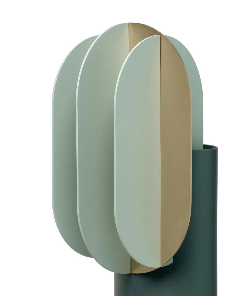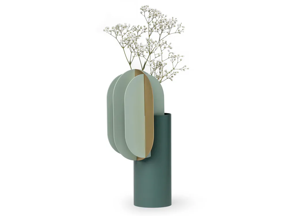 The Gabo Vase CS9 is a stunning piece from the Suprematic collection, inspired by the geometric artistry of Kazimir Malevich. Crafted in aquamarine and celery green brass, it serves not only as a decorative element but also as a functional holder for your favorite flowers. This elegant vase enhances any space, transforming even an empty design into a captivating art object. Perfect for collectors and enthusiasts of modernist art, the Gabo Vase is a must-have addition to your decor. Experience the beauty of Suprematism in your home today!