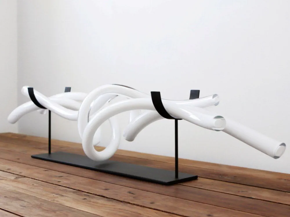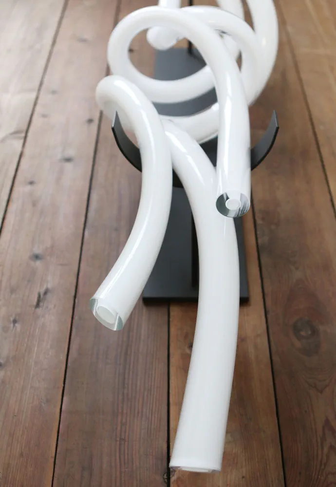 Experience the elegance of the COIL 48 decorative object, masterfully crafted from handblown Czech glass. With twisting tubes and polished ends, each piece is unique, capturing a dynamic moment in time. Available in Clear, Amber, and White, it adds a sophisticated touch to any space. Choose from various metal finishes for groups with a stand. Ideal for lovers of contemporary decor, this versatile piece enhances both home and commercial environments. Elevate your decor with the COIL 48 today!