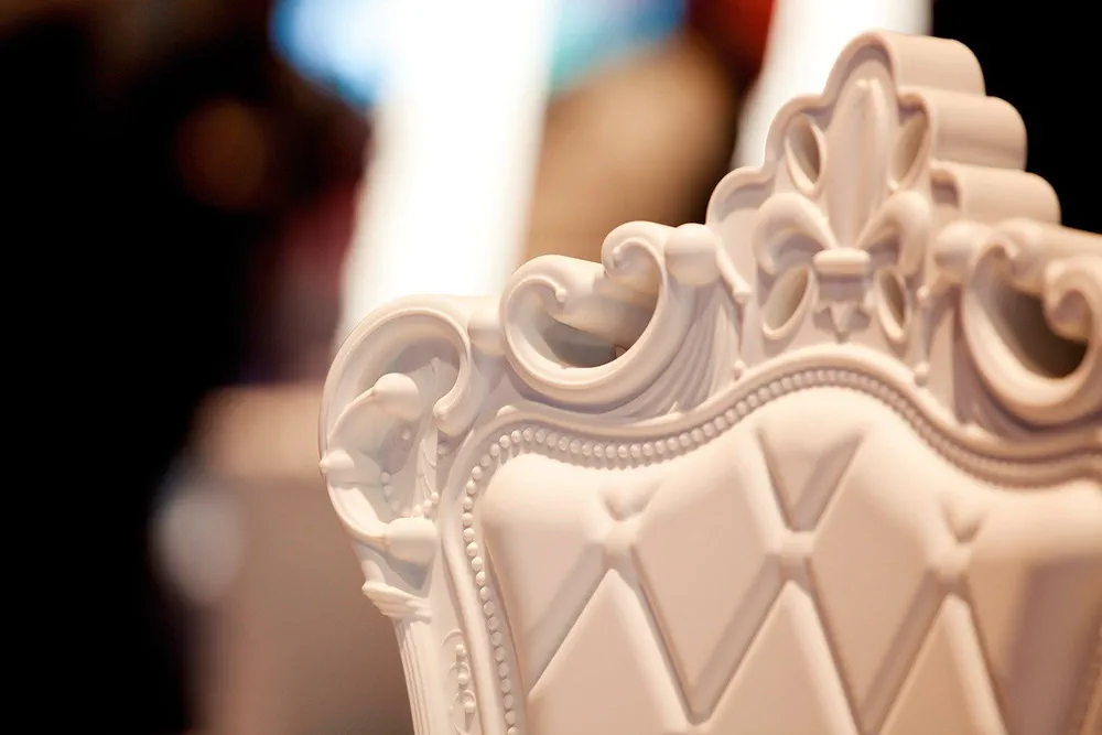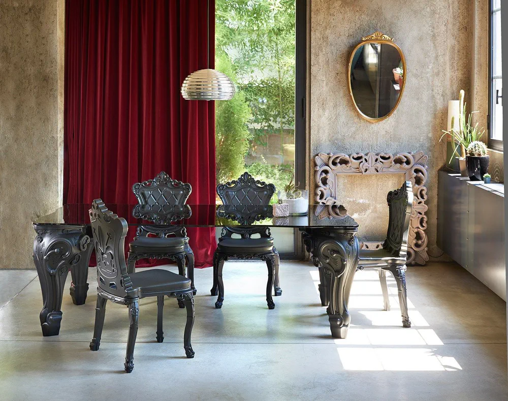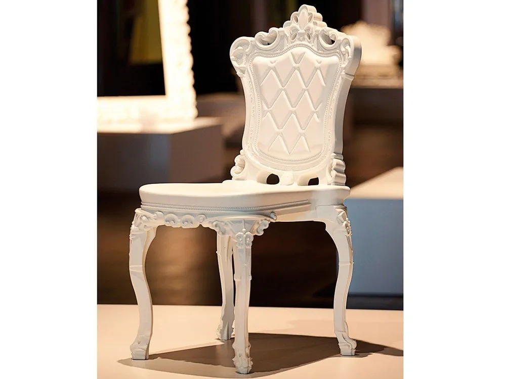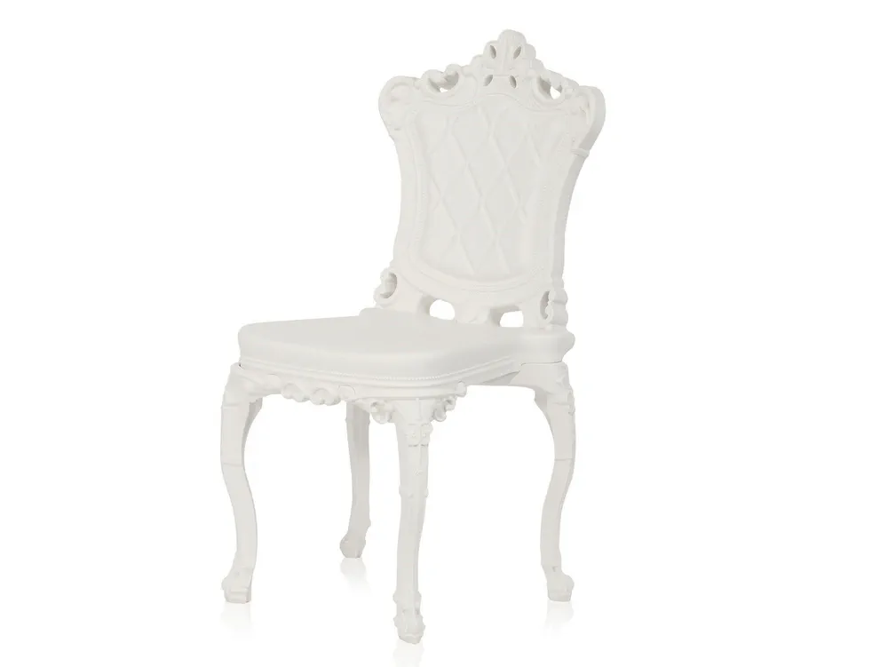 Introducing the sleek and stylish Princess of Love chair, a stunning reinterpretation of Italian baroque style. Crafted from durable polyethylene, this tufted design is perfect for adding a touch of vintage elegance to your indoor or outdoor spaces. Ideal for living areas, shops, and restaurants, its unique arched legs and richly detailed surface will elevate any setting. Available in glossy and matte finishes, it's both functional and fashionable. Experience the perfect blend of contemporary style and classic inspiration with the Princess of Love chair.