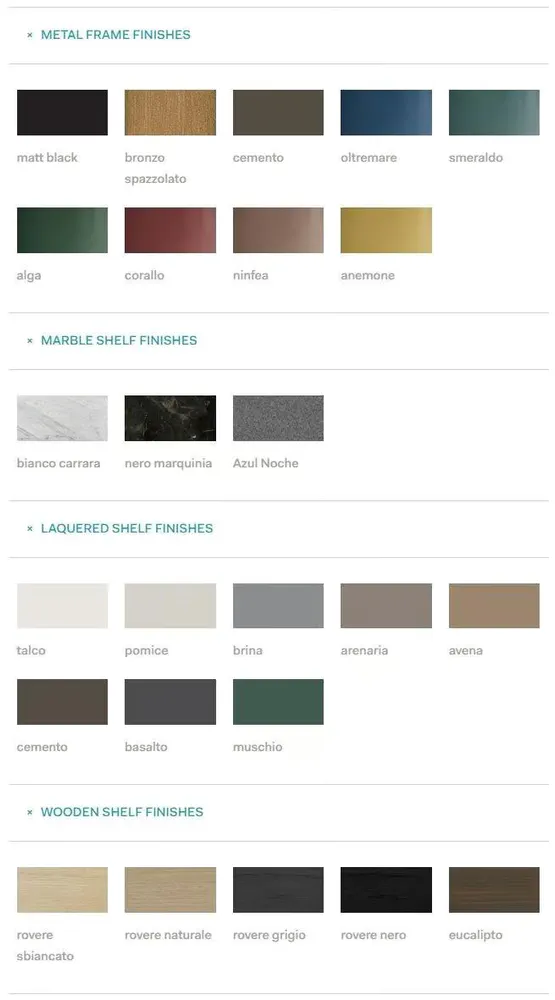 | Appearance | nero matt, cemento, bronzo spazzolato |