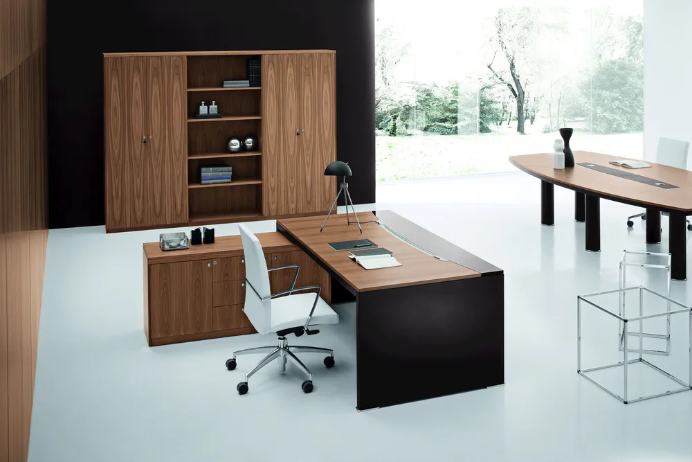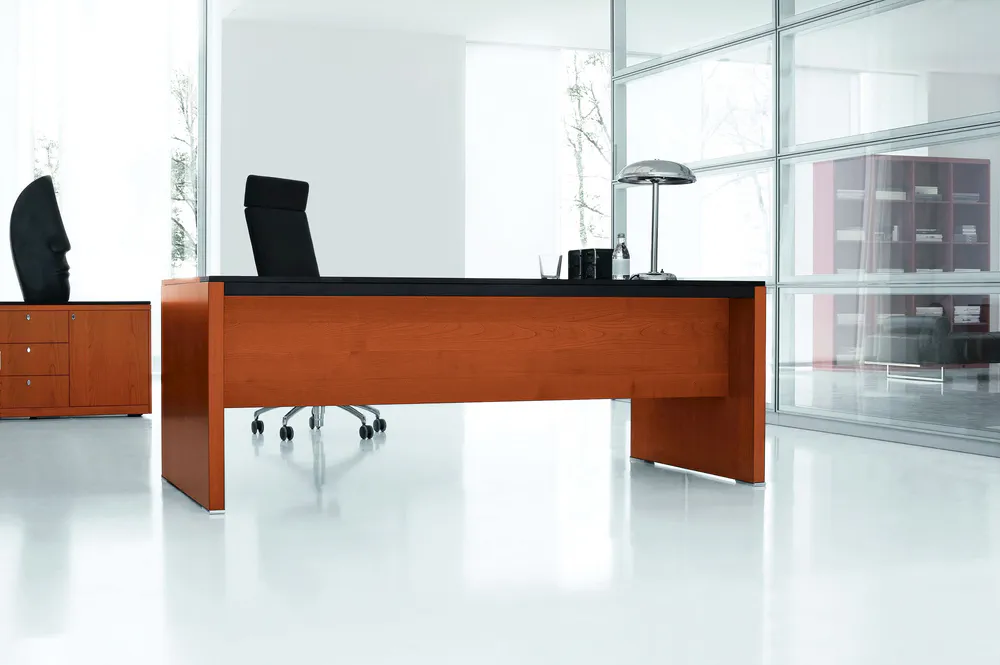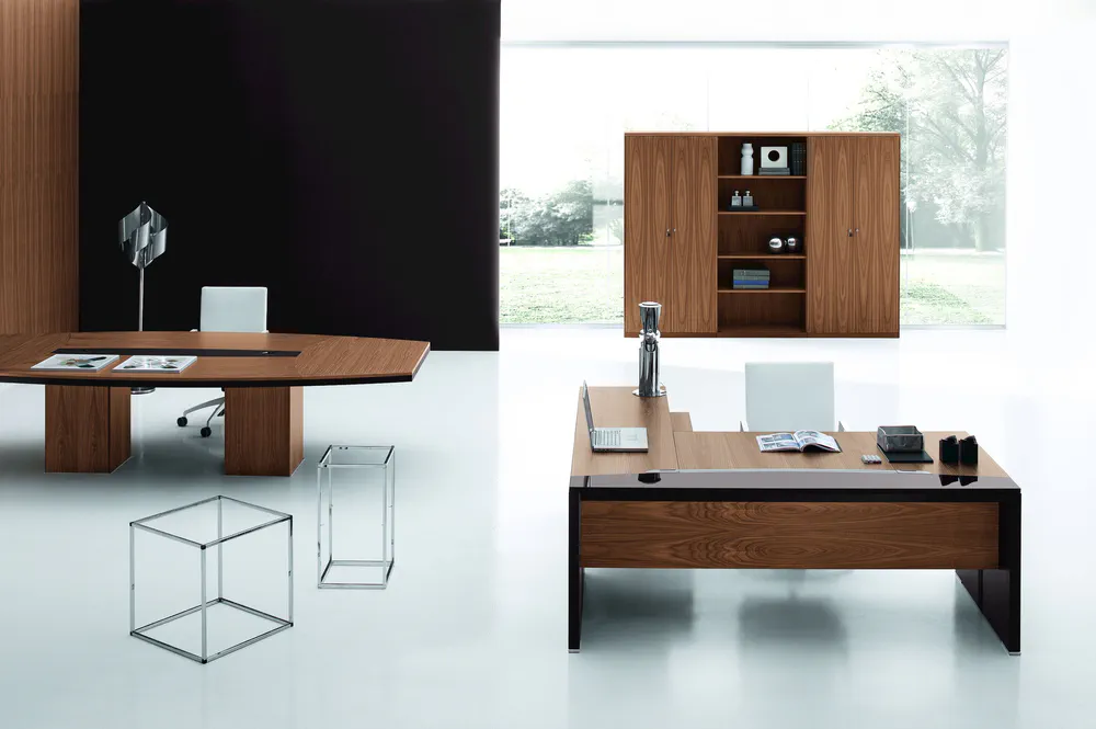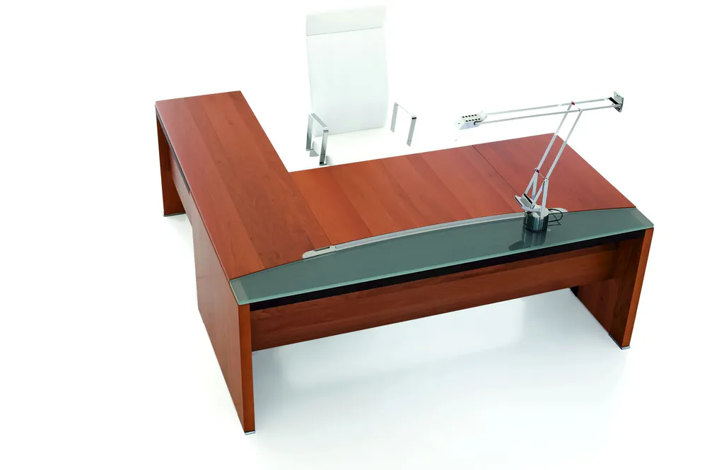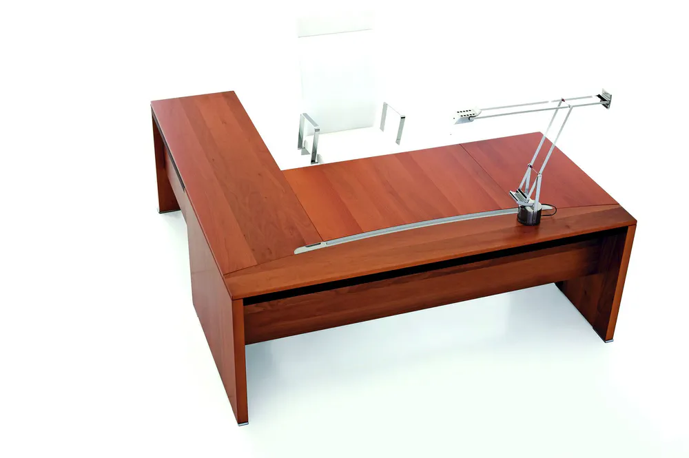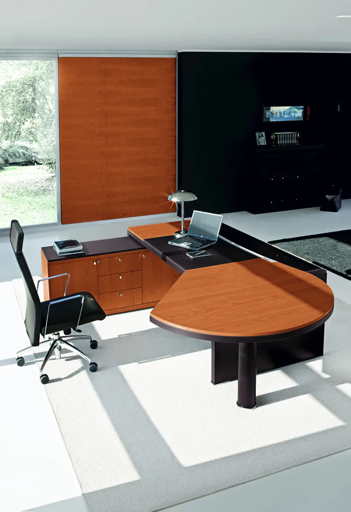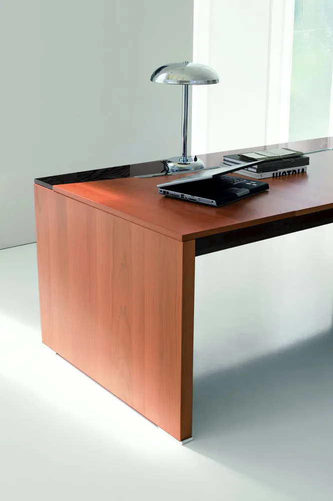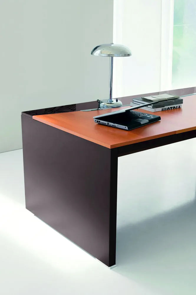 Experience the perfect blend of classic elegance and modern design with the Eko Executive Desk. Crafted from natural wood essences like cherry and walnut, this desk features brown lacquered panels and glass accents for a striking look. Ideal for both administrative tasks and meetings, it offers substantial work surfaces and practical cable compartments. Whether you're aiming for a sophisticated office environment or a stylish workspace, the Eko Executive Desk meets all your needs with its unique combinations and diverse configurations.