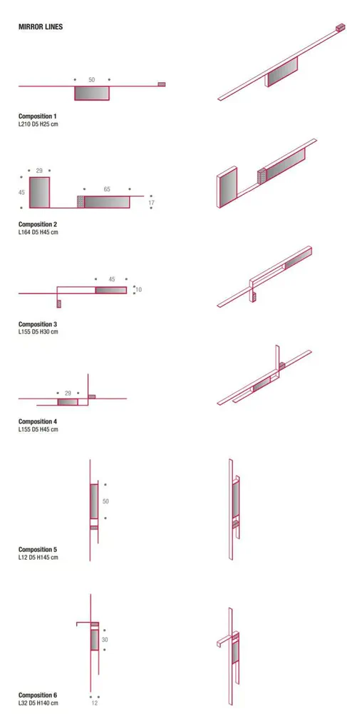 | Dimensions | composition 1: l210 d5 h25 cm, composition 2: l164 d5 h45 cm, composition 3: l155 d5 h30 cm, composition 4: l155 d5 h45 cm, composition 5: l12 d5 h145 cm, composition 6: l32 d5 h140 cm |