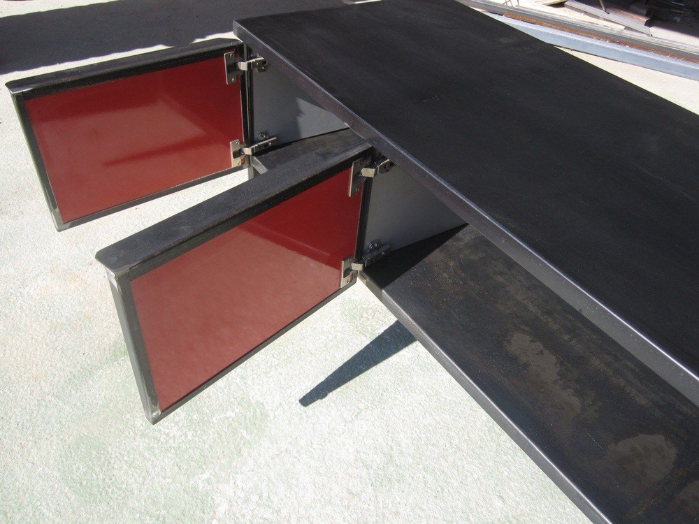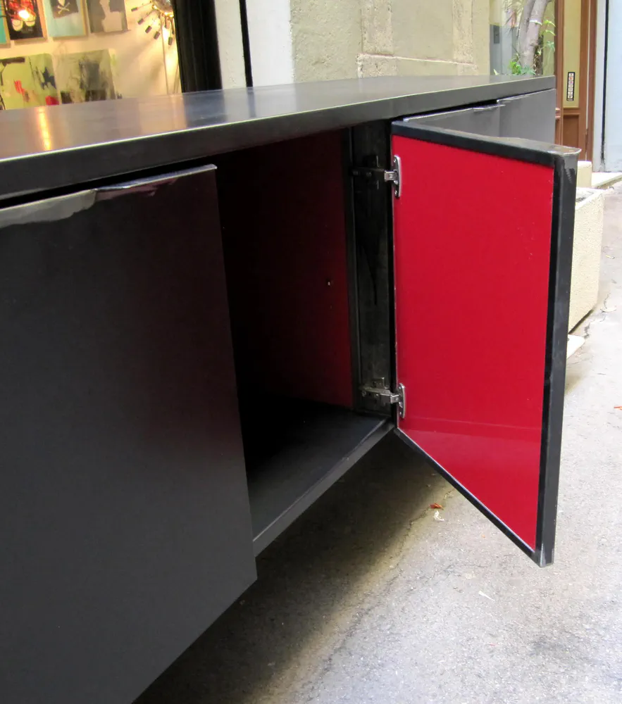 The Black Box is an exquisite aged steel low sideboard, meticulously handmade in Barcelona. Featuring striking red lacquered internal doors, it is perfect for both private and public spaces. This adaptable piece can be custom-designed to fit multimedia equipment, making it a versatile addition to your decor. Its robust construction and industrial style ensure it not only looks stunning but also offers long-lasting functionality. Elevate your space with this unique piece from the handmade metal furniture collection.