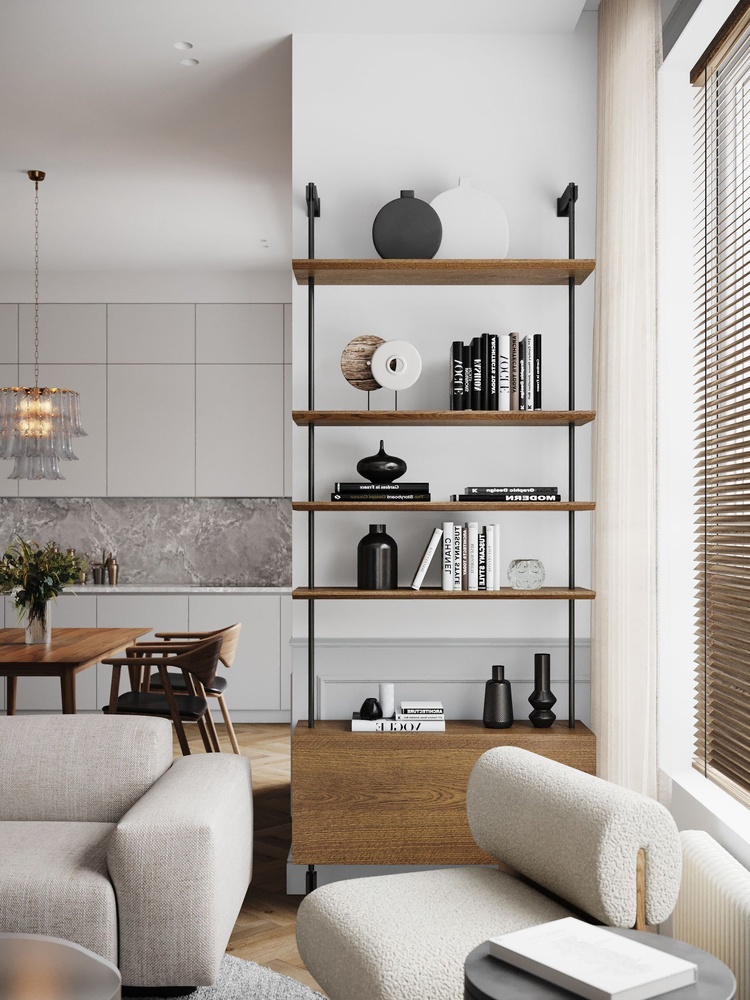 Introducing the PIRA G2, an exquisite open floor-ceiling mounted bookcase that seamlessly blends function and style. This unique piece, crafted from high-quality lacquered steel and extruded aluminum, offers a striking presence in any room, serving as both a functional storage solution and an eye-catching room divider. With a robust load capacity of 50kg, the PIRA G2 features 12 shelves and versatile cabinet options in walnut or white oak, providing warmth and elegance. Perfect for larger living areas or public spaces, the PIRA G2 showcases modern design with a nod to the 1950s. Elevate your home or office with this architectural masterpiece.