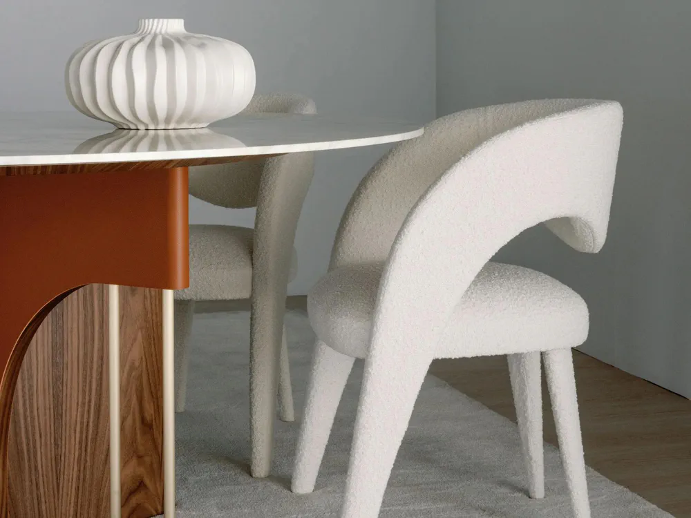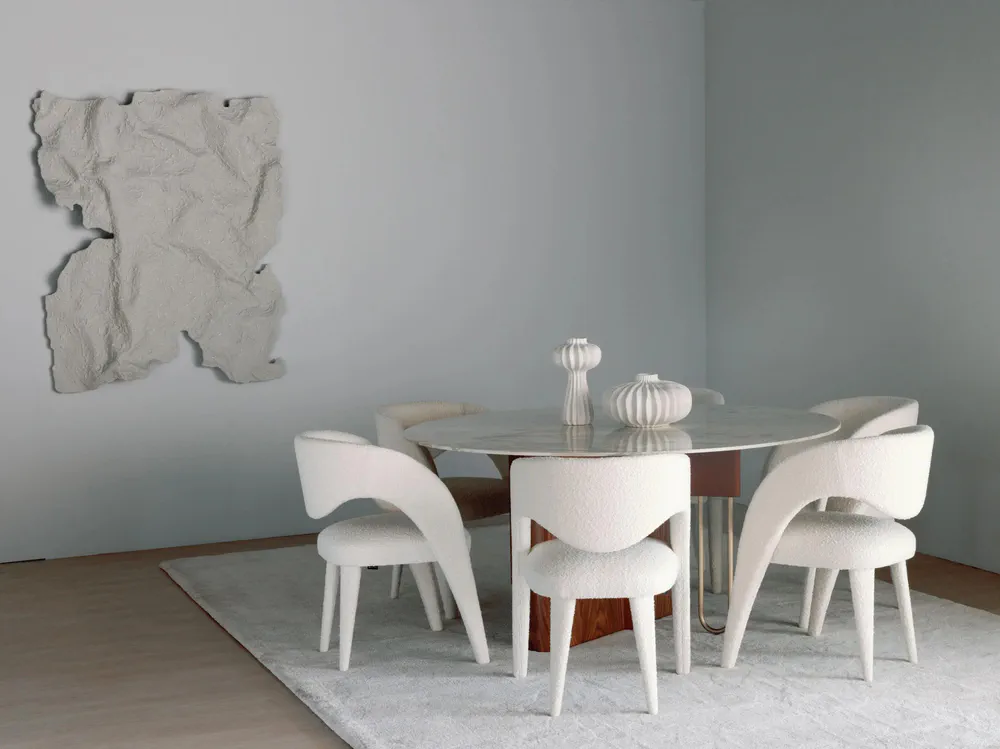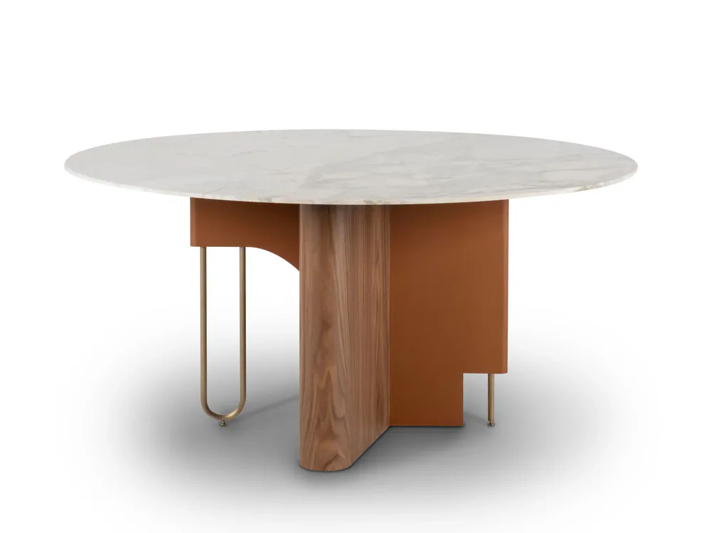 Experience the elegance of the FERREIRINHA round dining table, a stunning blend of Italian leather, walnut veneer, and Calacatta Cremo marble. This table pays tribute to a remarkable Portuguese businesswoman, reflecting her spirit of leadership and generosity. Its luxurious design features an impressive silhouette that will elevate any dining space. Perfect for gatherings, the table combines style and functionality, making it a unique centerpiece for your home. Invest in this masterpiece that symbolizes beauty and strength today!