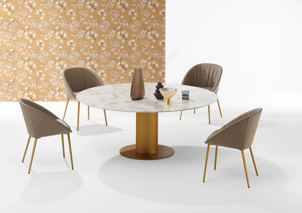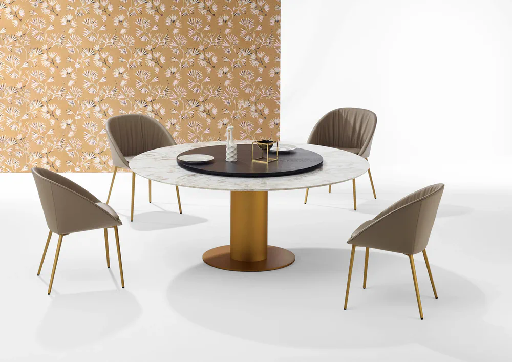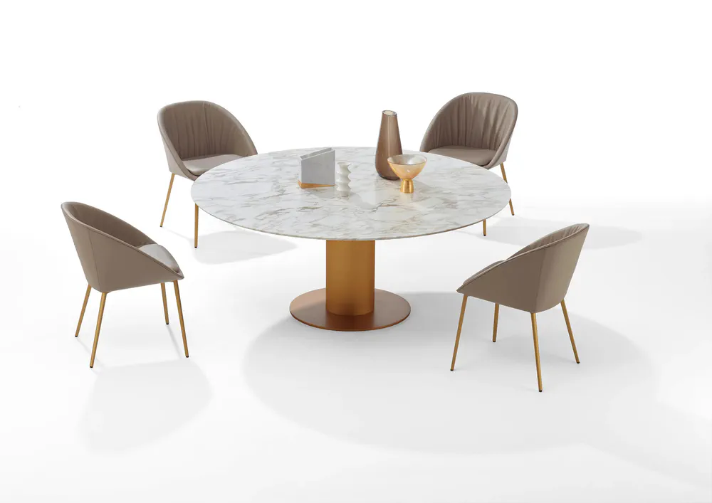 Discover the stunning NELLY 1511-I round dining table, crafted from exquisite natural stone. This versatile piece features an optional attachable, rotatable veneered inner plate for added functionality. With a robust steel tube base and a choice of surface finishes, this table blends elegance with practicality. Select from 150 types of stone to create a unique centerpiece for your dining area. Elevate your space with this exceptional fusion of style and craftsmanship.