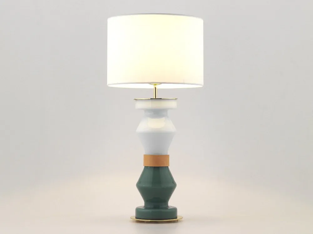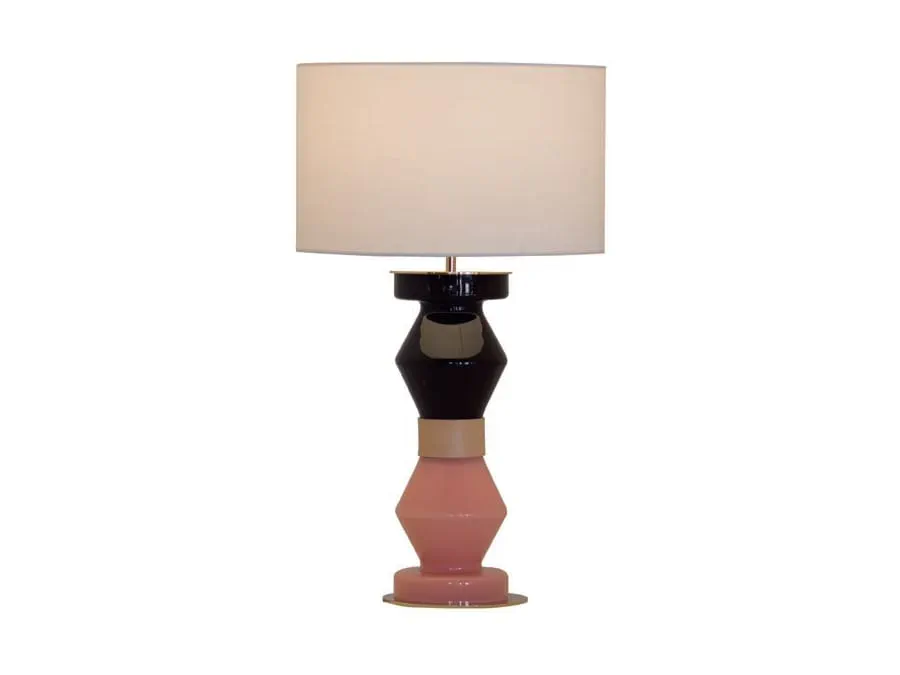 Illuminate your space with this stunning stained glass table lamp featuring a fixed arm. Crafted with a beautifully lacquered finish in vibrant colors, it complements any contemporary decor. The stylish chrome or gold metal parts add a touch of elegance, while the leather ribbon detail enhances its unique design. Perfect for creating a warm and inviting atmosphere, this lamp is versatile for various settings. Please note, bulb and shade are not included. Upgrade your lighting experience today!