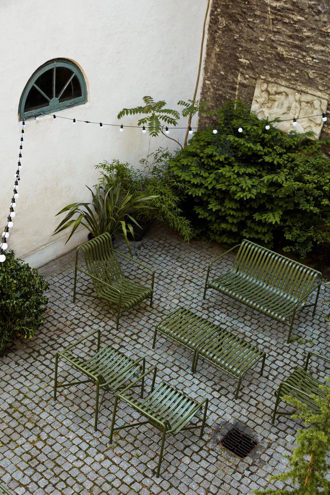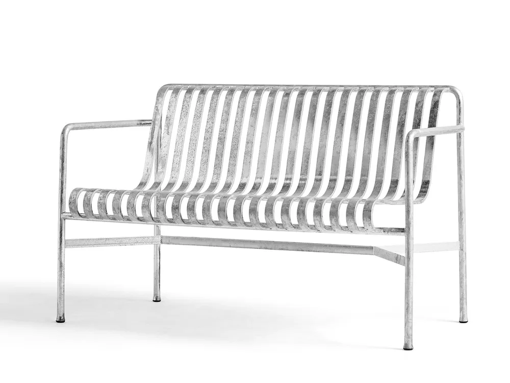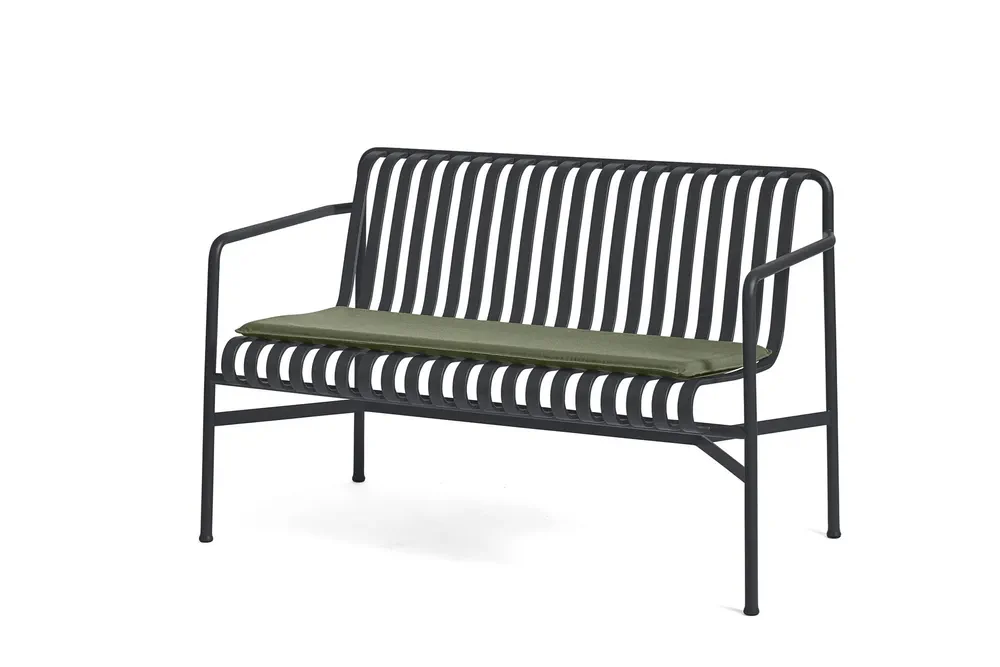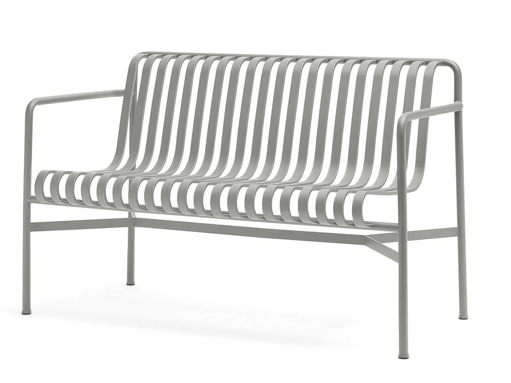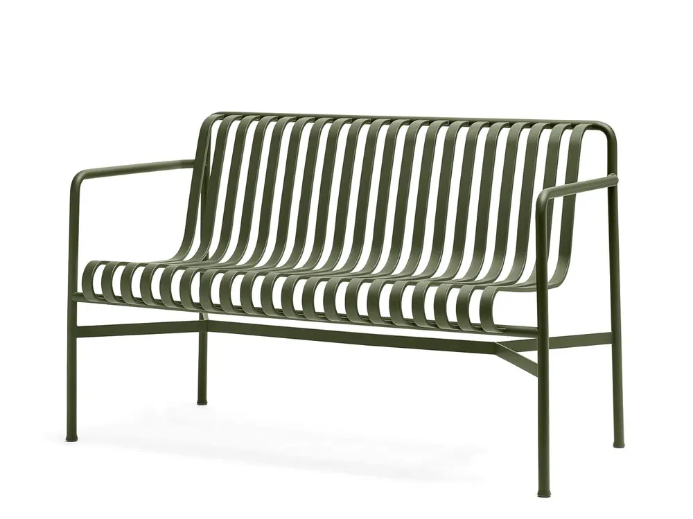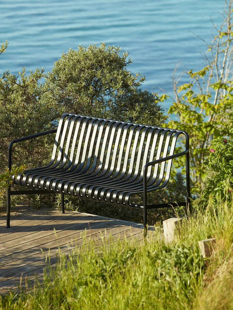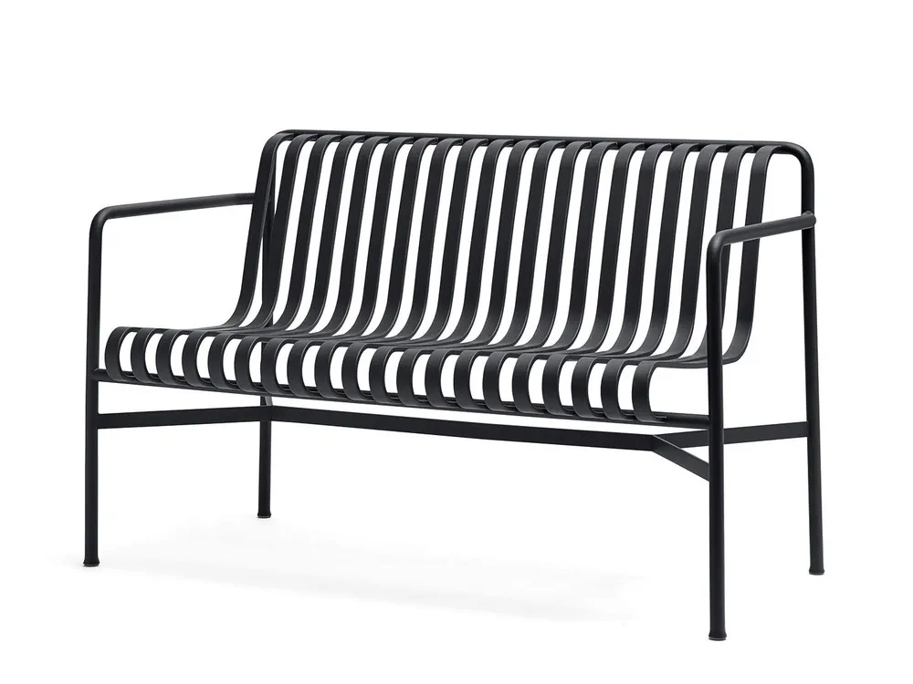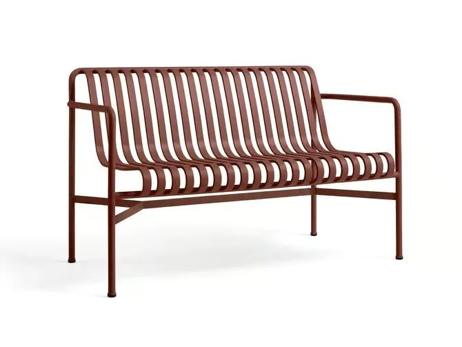 Introducing the PALISSADE Steel Garden Bench with Armrests, designed by Ronan and Erwan Bouroullec. This robust piece from the Palissade collection seamlessly blends into any outdoor space while offering comfort and style. Made with durable powder coated steel, it withstands the elements, making it ideal for gardens, terraces, or cafés. Its modern design and elegant finishes in anthracite, sky grey, olive, and iron red enhance any setting, ensuring it remains a stunning focal point for years to come. Upgrade your outdoor experience with this beautifully crafted bench.