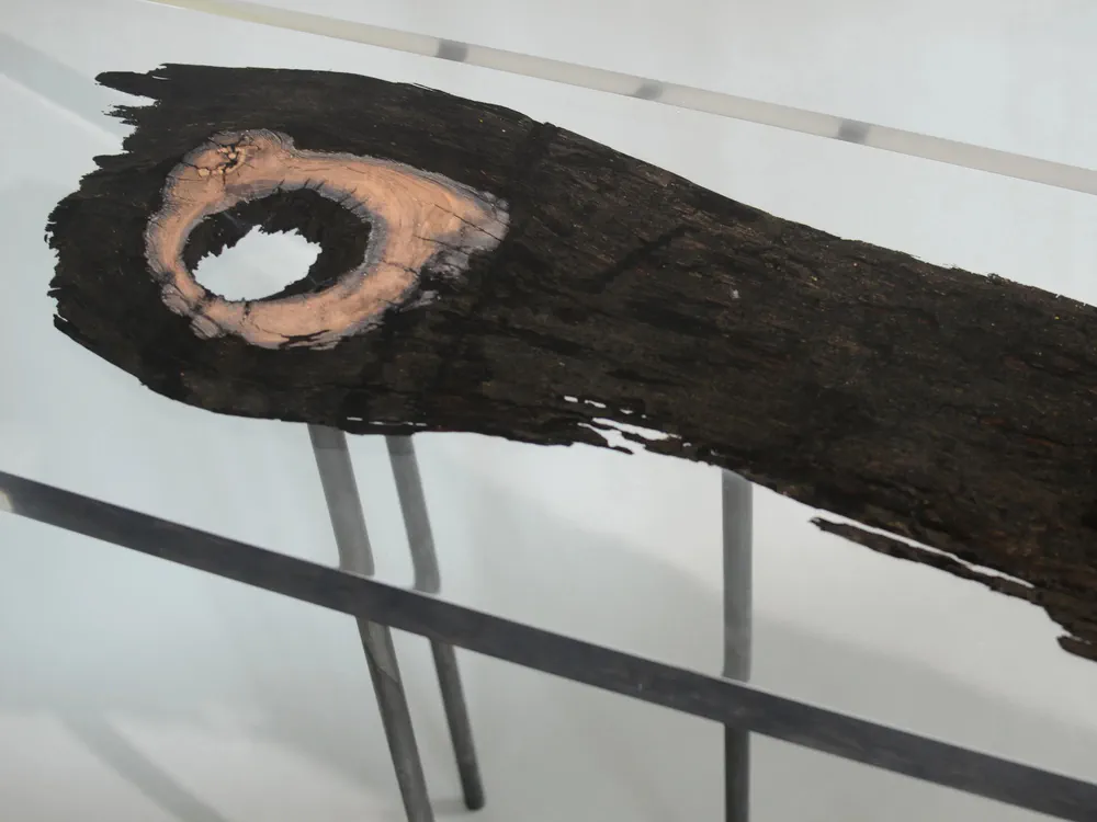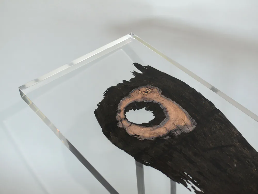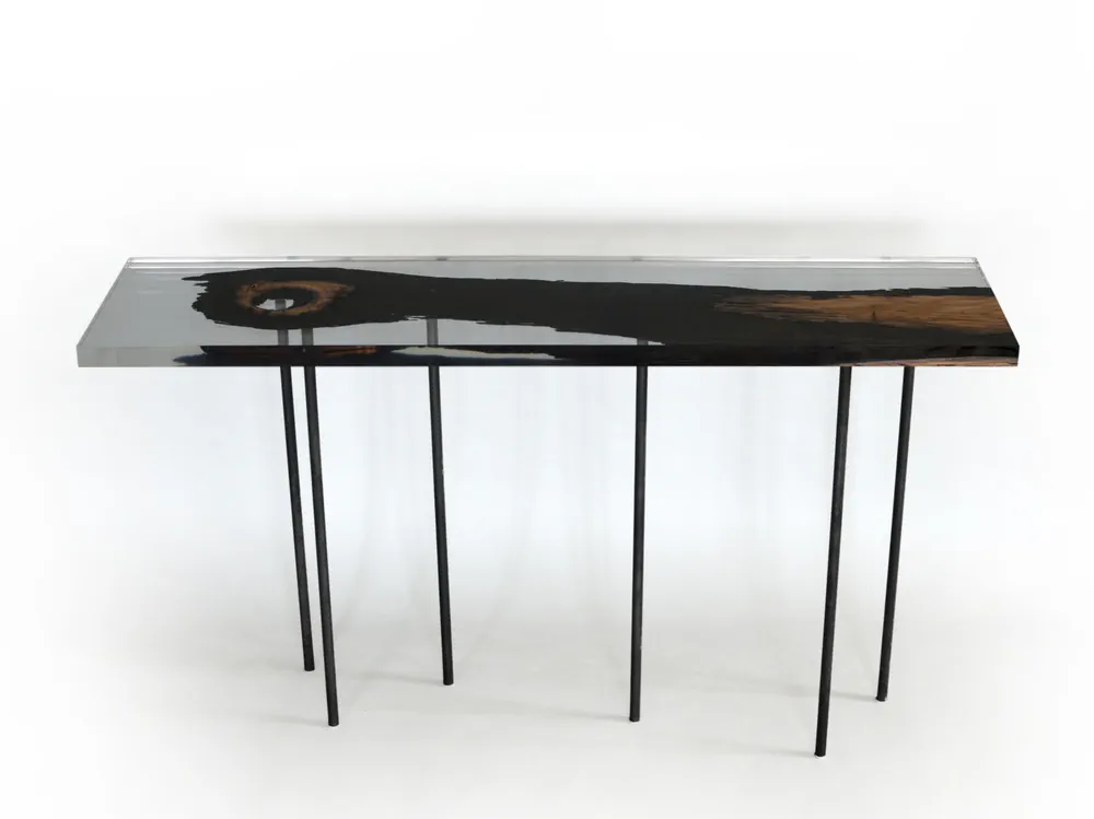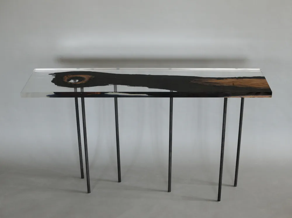 The Wetland Relic console table is a stunning blend of nature and craftsmanship. Crafted from ABONOS OAK WOOD preserved in EXTRACLEAR RESIN, this piece showcases a unique wood grain that changes from golden to black, ensuring each table is distinct. The BURNISHED STEEL base adds a contemporary touch, making it perfect for any modern living space. With customizable options available, you can make this table a true reflection of your style. Elevate your home with this exquisite fusion of exquisite design and organic beauty.