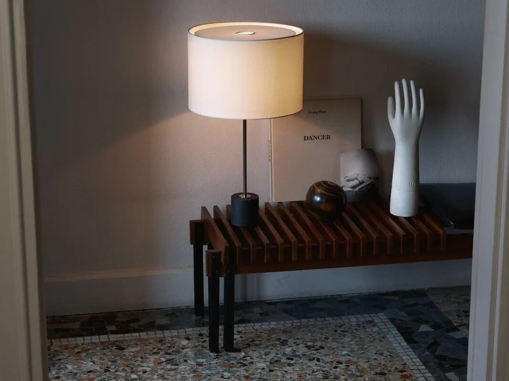 The KILO TL lamp features a stunning design with a solid blackened steel base and a luxurious silken shade. Standing at 55.5 centimeters, this table lamp defies balance with its small base and large shade, providing a striking counterpoint to traditional floor lamps. Ideal for console tables and delicate surfaces, it casts ambient illumination that enhances any space. Available in polished nickel and brass finishes, this lamp reflects contemporary elegance and durability, making it a must-have for stylish interiors.