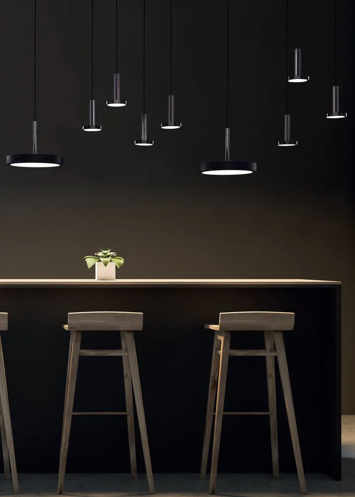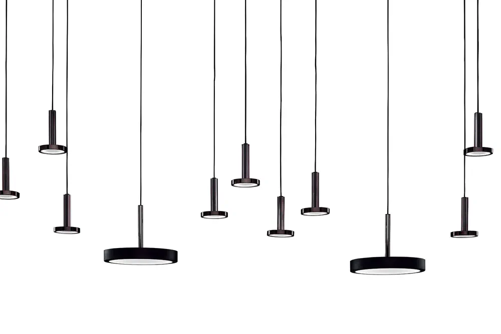 The Vector LED pendant lamp offers a stunning blend of contemporary design and energy efficiency. Available in two powerful versions, this handmade lamp features shiny gold-satin or black nickel finishes, complemented by sleek disks in smoky grey and bronze colors. Ideal for both residential and commercial spaces, it's designed to illuminate your environment while adding a touch of elegance. Don't miss the chance to elevate your lighting game with this eye-catching fixture that meets all your lighting needs!