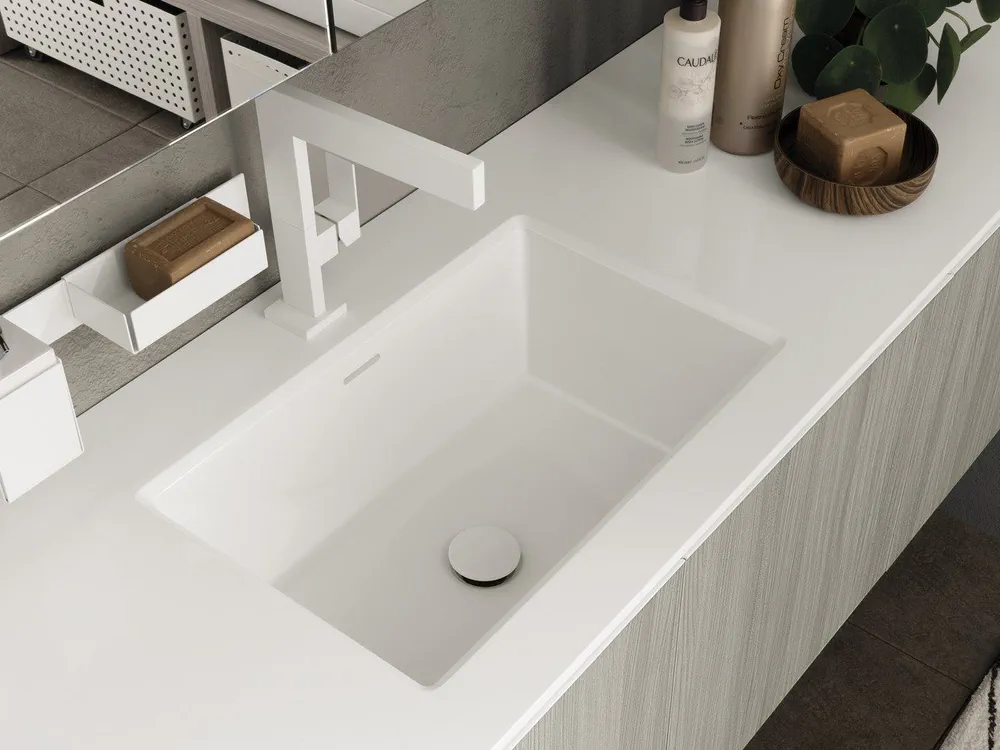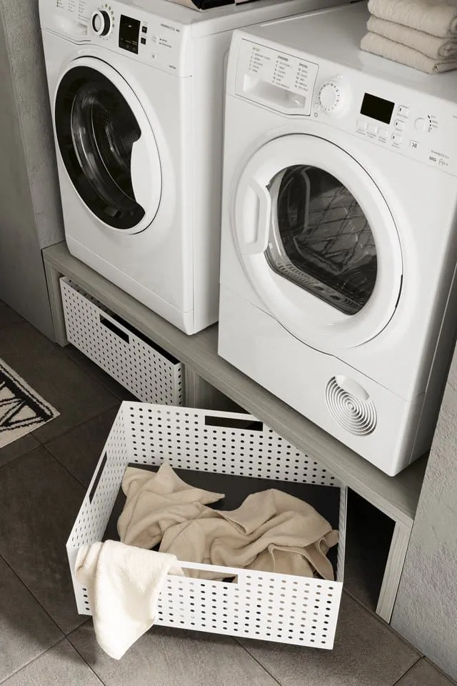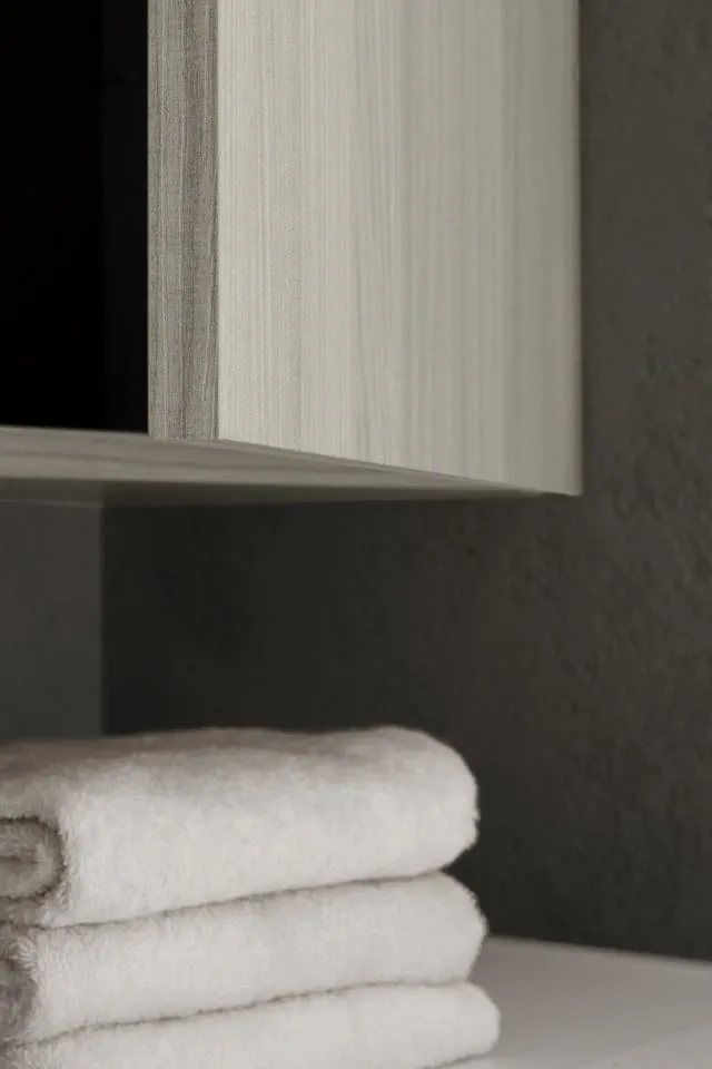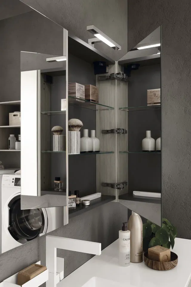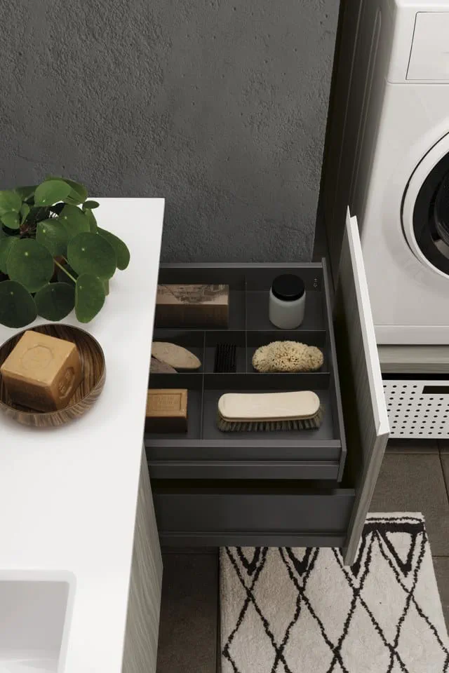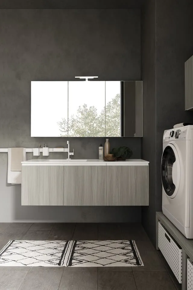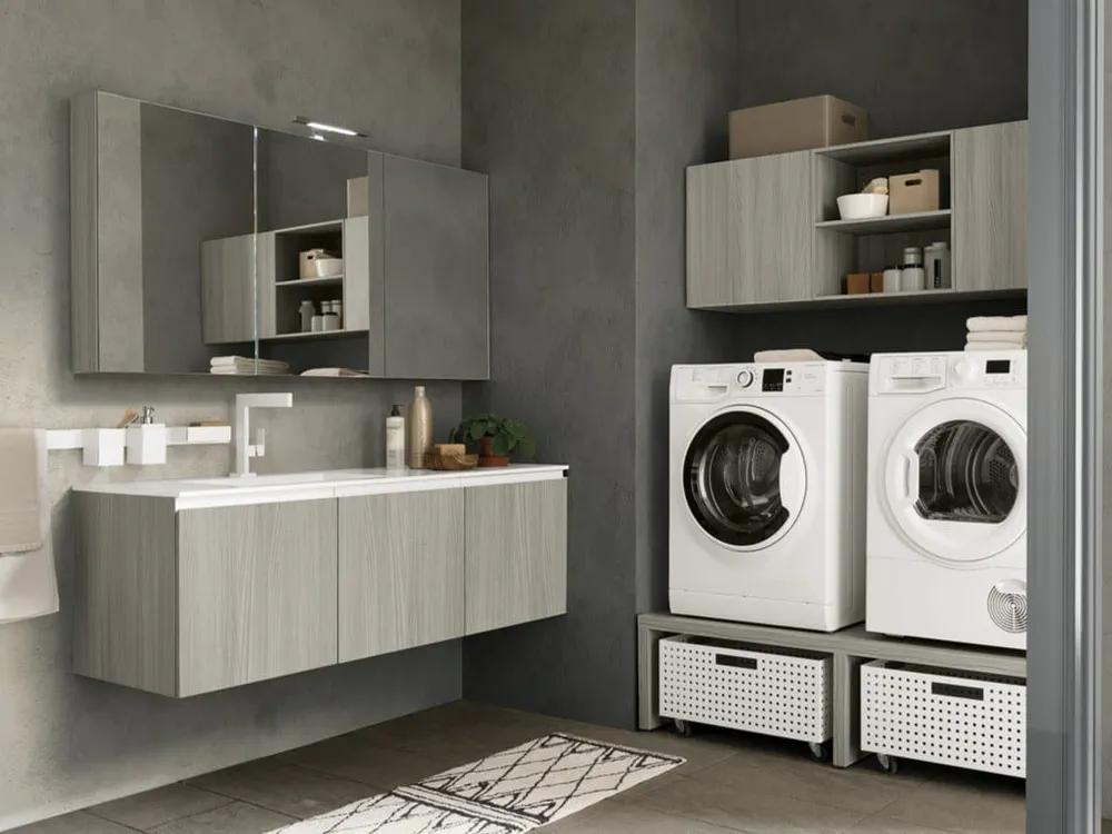 Discover the exceptional Laundry 05 cabinet, expertly crafted with matt lacquered wood and designed for maximum utility. Featuring spacious double shelving for a washing machine and dryer, it also offers a mirror cabinet and ample storage for laundry essentials. The glossy white Geacryl top complements the Skin Grigio finish, providing a sleek and contemporary look for your laundry or bathroom-laundry space. With modular components and innovative accessories, it transforms functionality and aesthetics effortlessly. Elevate your laundry experience with this organized solution today!