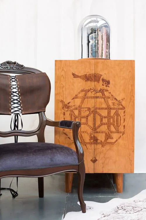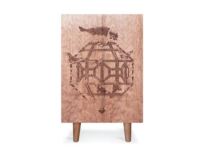Elevate your space with the Ornithological Sketch Cabinet, a stunning wooden highboard featuring intricate etchings inspired by nature. Designed by the talented Courtney Brims, this exquisite piece combines beauty and functionality. With three adjustable shelves, it serves as an elegant storage solution for cocktails, clothes, or office essentials. The intricate designs of birds and butterflies showcased on a jewel-like cage will make this cabinet a centerpiece in any room. Experience a blend of artistry and utility with this unique highboard that adds a touch of luxury to your home.