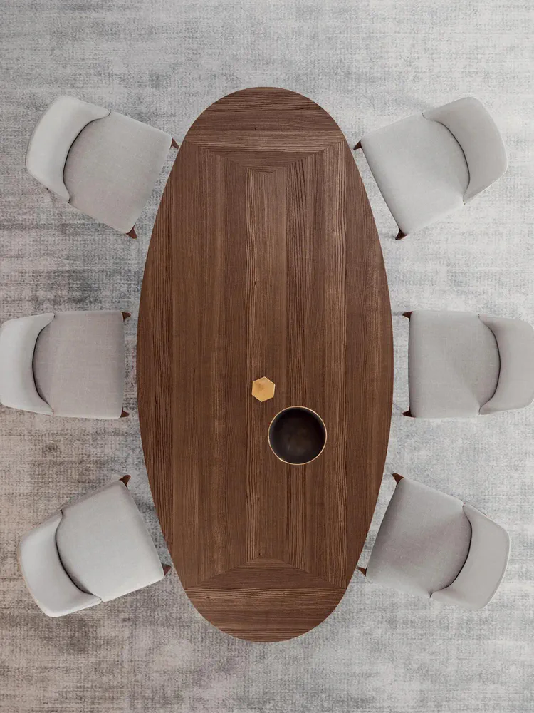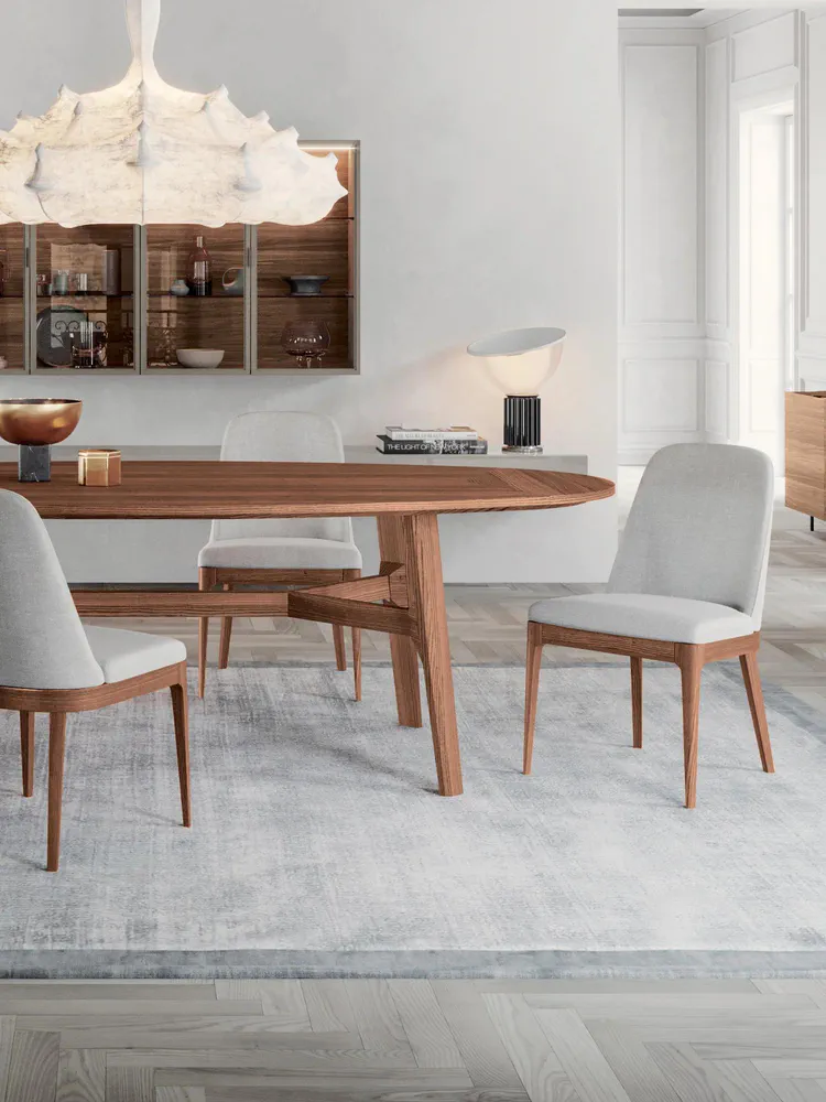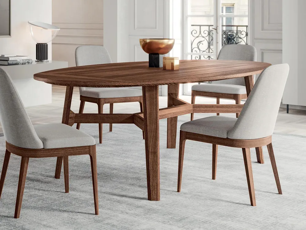 Experience elegance and versatility with the MOOR Oval Wooden Dining Table. Its fixed top offers six different configurations and finishes to seamlessly blend with your decor. The table's soft lines and luxurious wood grain create a stunning centerpiece for any dining area, while the solid wood structure provides stability and durability. Perfect for both intimate dinners and grand gatherings, the MOOR table elevates your dining experience with its contemporary style and thoughtful design. Transform your space today with this exquisite piece of furniture!