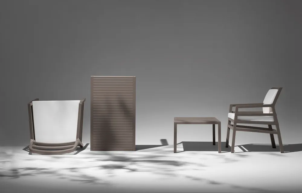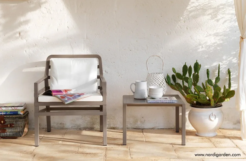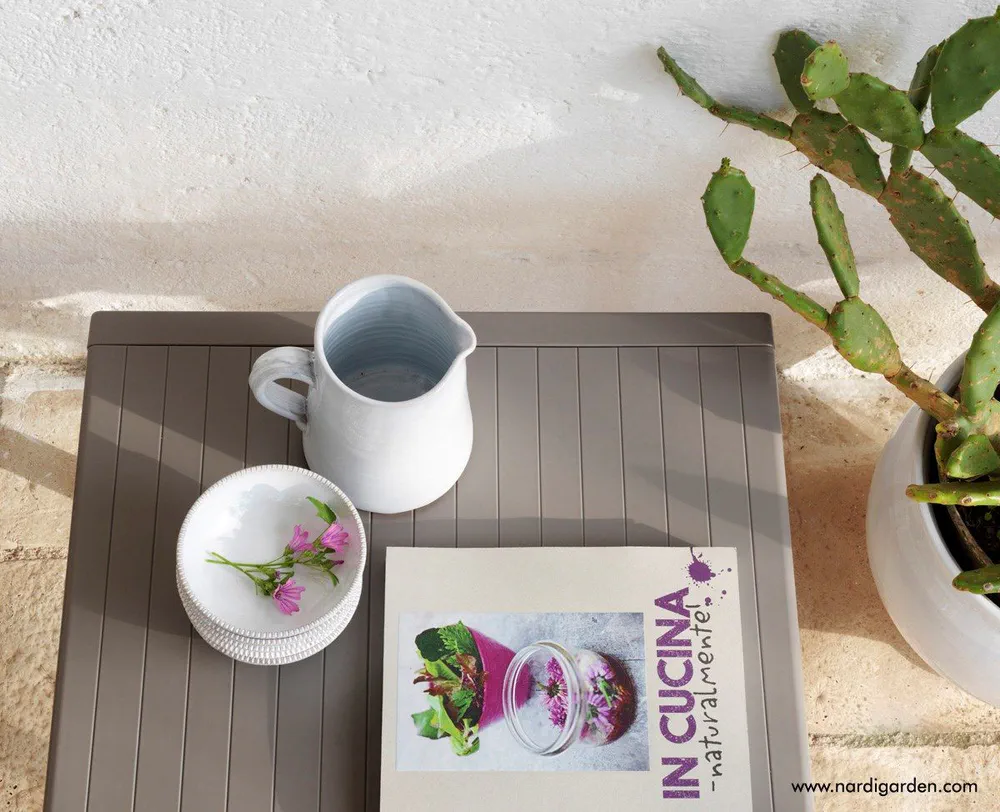 Introducing the Aria Tavolino 60, a stylish square garden side table designed for both indoor and outdoor use. Its elegant slatted top resembles lacquered wood, ensuring a modern look while constructed from recyclable, UV-treated resin for exceptional durability. With a height of 40 cm and a footprint of 60 cm by 60 cm, this lightweight table, weighing just 5 kg, is perfect for any setting. Fitted with non-slip feet, your gatherings will be stable and stylish. Embrace versatility and sophistication with the Aria Tavolino 60, an essential addition to your garden or lounge.