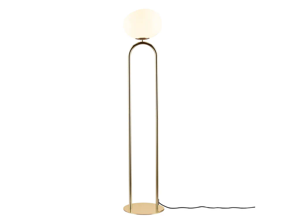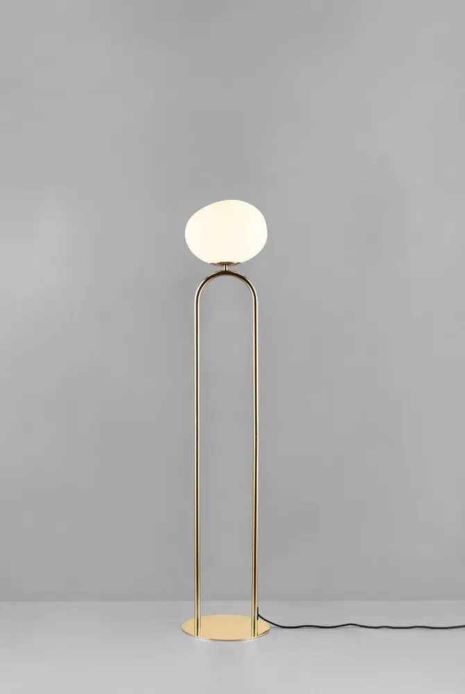 Illuminate your space with the Shapes floor lamp by Danish designer Maria Berntsen, inspired by elegant jewelry designs. Its unique, asymmetrical opal glass shade beautifully harmonizes with a shiny brass base, creating a soft diffused light ideal for both work and relaxation. Featuring a non-replaceable black textile cable and an easy-to-use switch on the cable, this lamp embodies contemporary elegance and functionality. Upgrade your home decor with the stunning Shapes floor lamp that adds a touch of sophistication to any room.