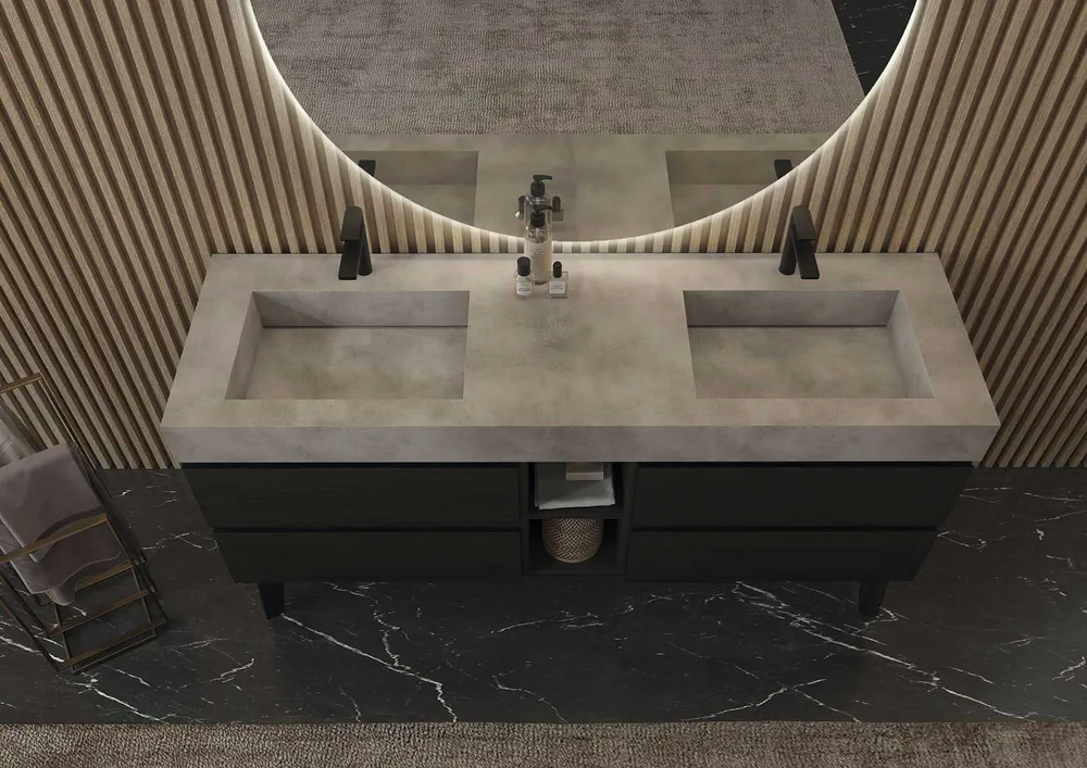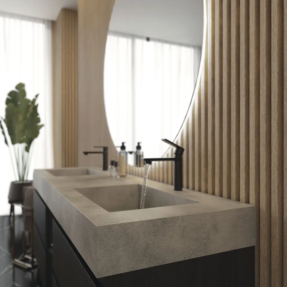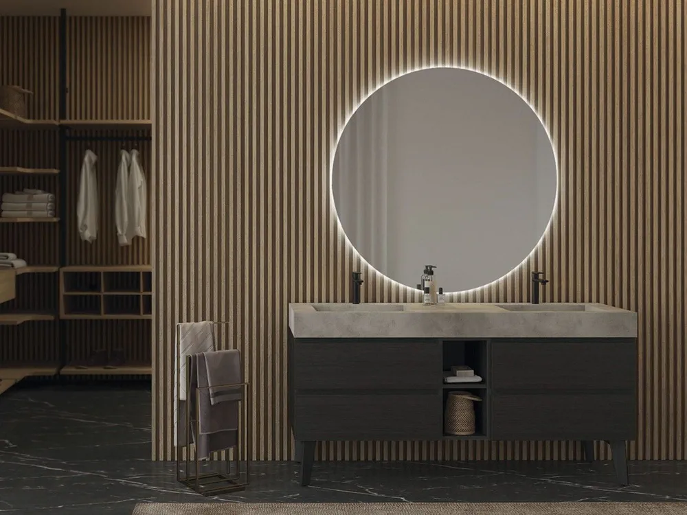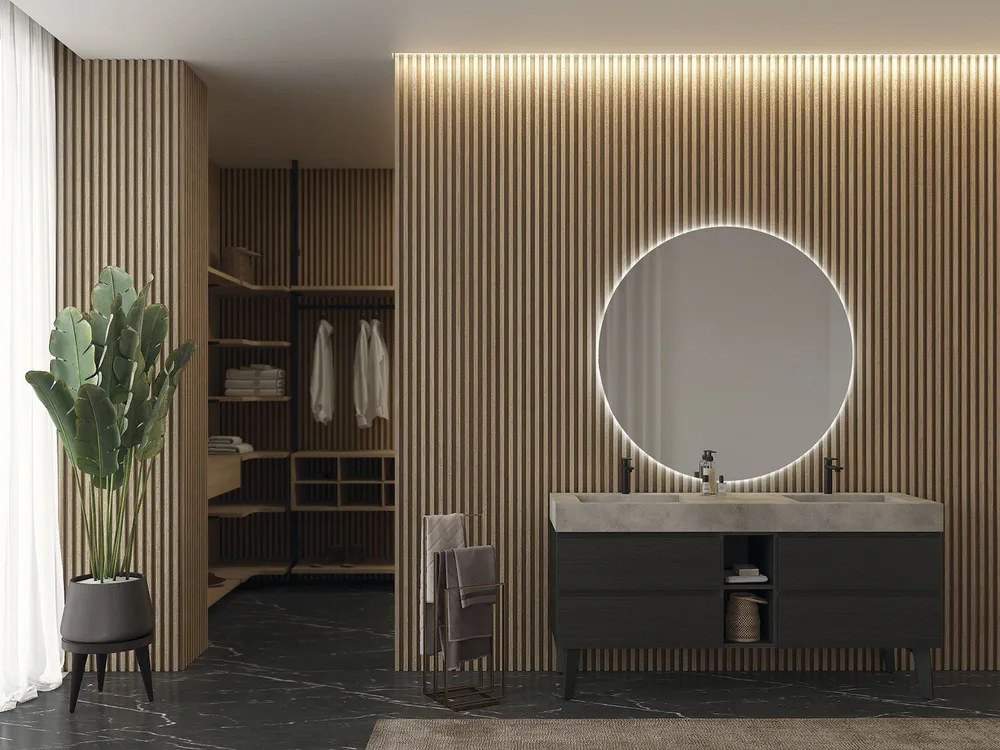 Introducing the FREEDOM FL05, a stunning double wooden vanity unit designed to elevate your bathroom experience. Featuring a sophisticated Mabathu Anthracite finish, the unit comes with an elegant backlit round mirror and a durable HPL top with integrated double basin in a sleek Concrete finish. This innovative design not only optimizes space but enhances aesthetics, creating a luxurious look. With its hidden handles and unique styling, it's perfect for modern living, turning your bathroom into a sanctuary of style and functionality.