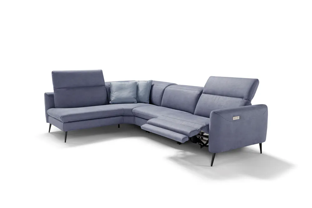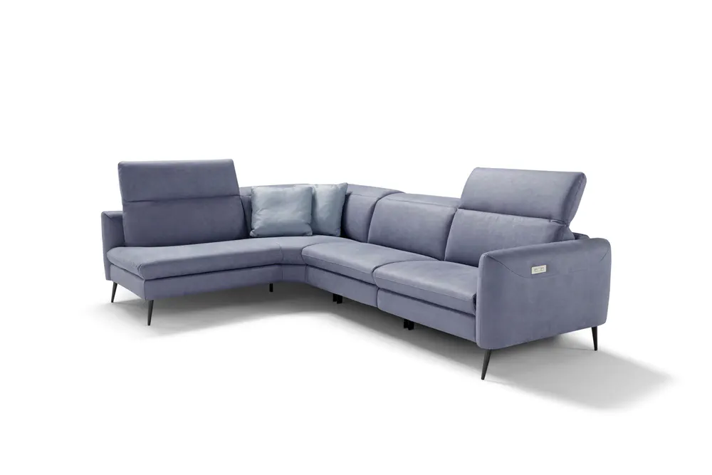 Introducing the Dusk Corner Recliner Leather Sofa, a perfect blend of elegance and functionality. With its soft, minimal lines and high spiked feet, this sofa elevates any space, from cozy apartments to formal rooms. Choose from over 600 customizable coverings to match your unique style. The sofa offers a relax version equipped with a manual ratchet headrest, ensuring personalized comfort tailored to your preferences. Transform your living area with this luxurious, adaptable piece that guarantees both comfort and aesthetic appeal.