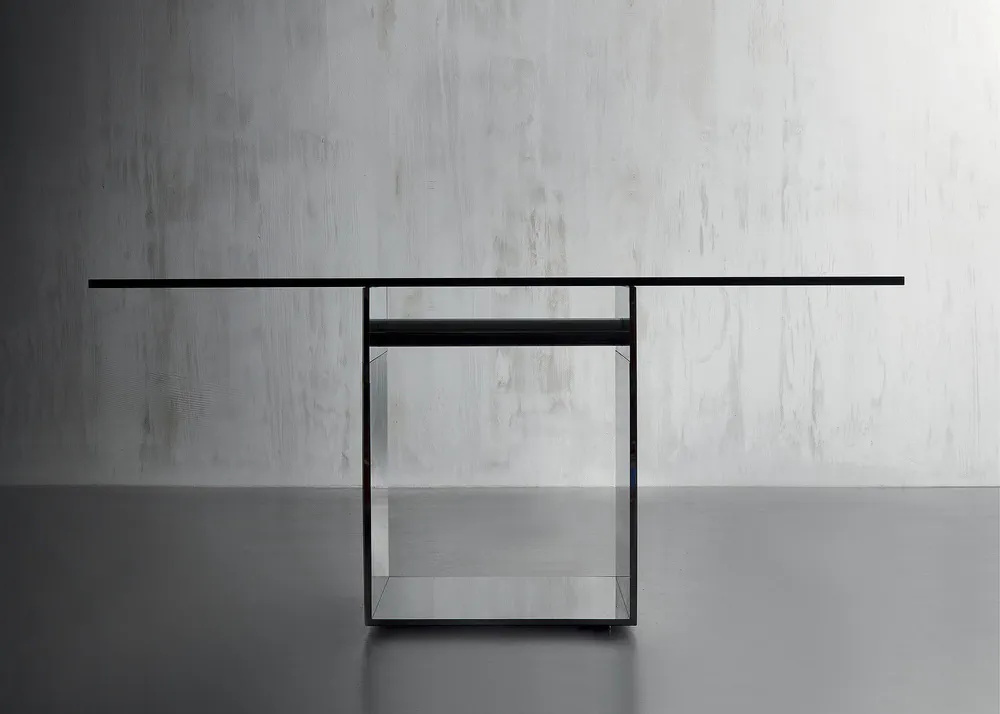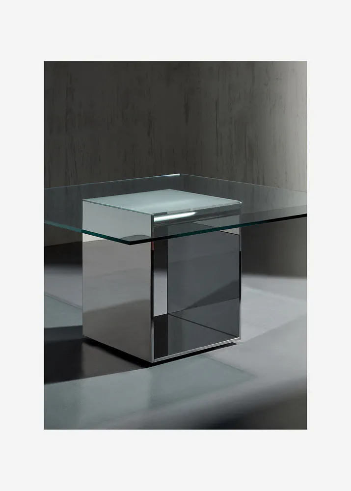 Elevate your space with the Glimm Square Glass and Stainless Steel Table, crafted by award-winning designers Gabriele and Oscar Buratti. This table features a sleek, transparent glass top paired with a striking rectangular stainless steel base. Available in various interior finishes like black eucalyptus and mirrored glass, it seamlessly fits into modern interiors. With a thoughtful minimalistic design and an elegant profile, the Glimm table is not just furniture, but a statement piece that transforms your living space.