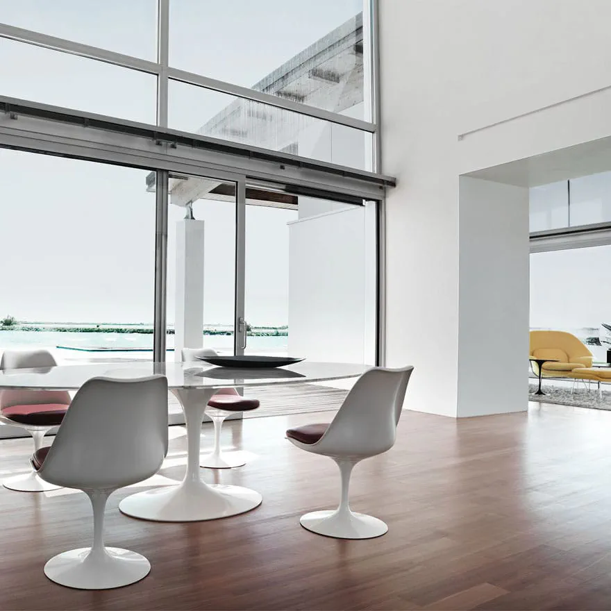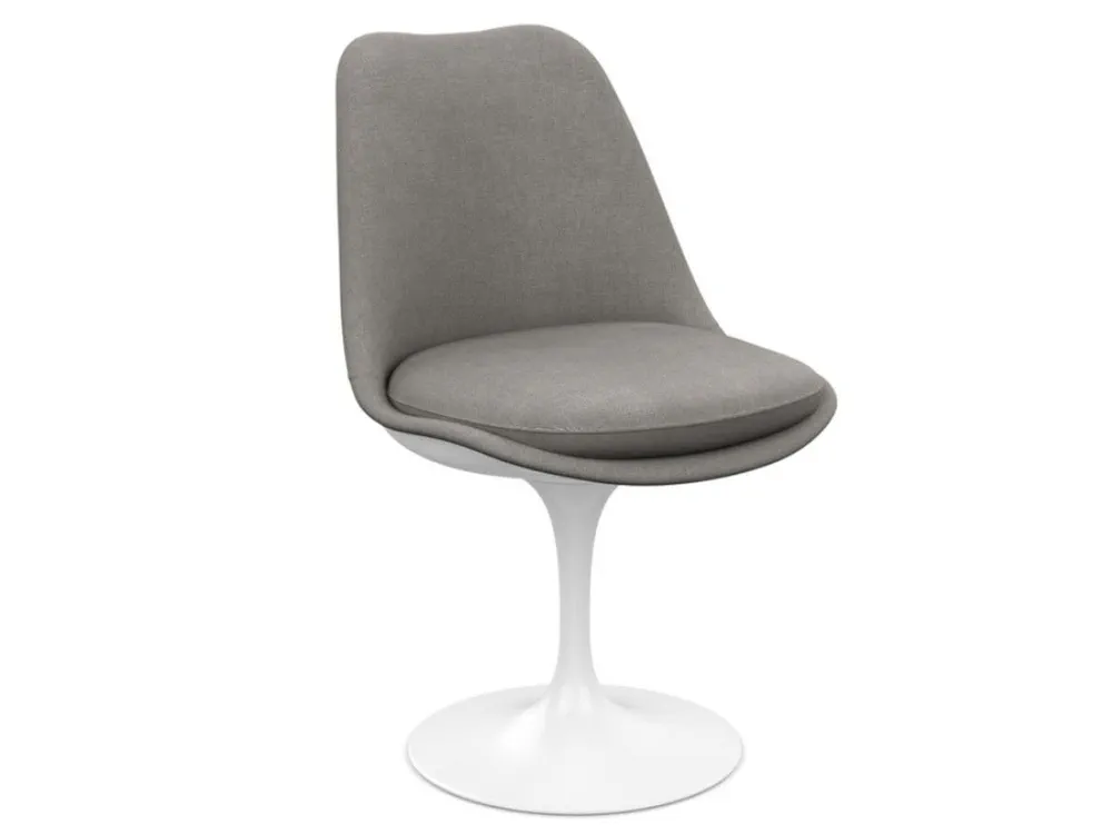 The Tulip upholstered fabric chair offers a sophisticated design by Eero Saarinen, perfect for modern interiors. Its distinct molded fiberglass shell is available in a variety of colors and fabrics, providing customizable comfort and style. This chair features a robust cast aluminum base with a Rilsan coated finish or a polyurethane coat for added durability. Ideal for both residential and commercial spaces, the Tulip continues to be an icon of contemporary design, celebrated for its aesthetic appeal and functional comfort. Upgrade your seating arrangement and impress your guests with this timeless masterpiece.