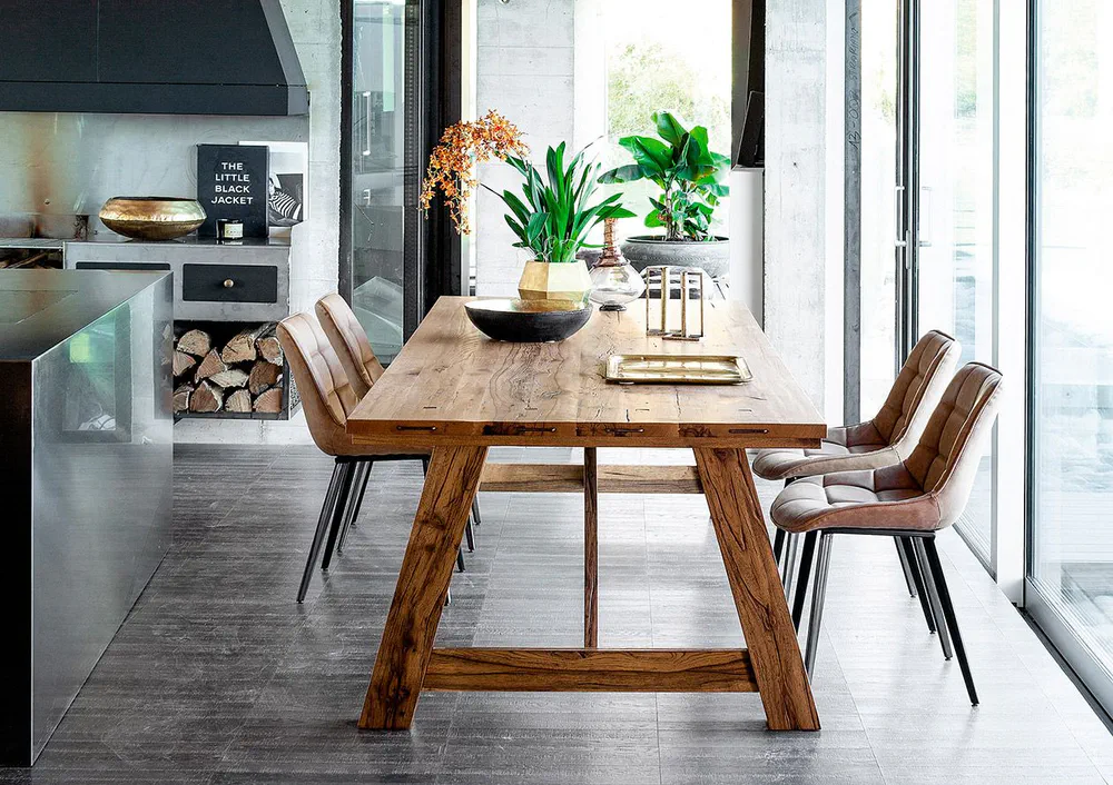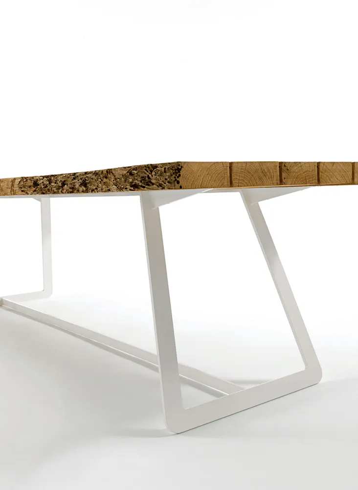 Introducing the Calle Briccola table, a stunning centerpiece crafted from exquisite Briccola planks with natural edges, complemented by a robust iron base. Available in multiple sizes, this table features a light color and is supported by elegant U-shaped legs for visual appeal. It's not just a table; it's a statement piece perfect for contemporary living spaces. Customize with your choice of finishes for the base, including lacquered options in various colors. Enhance your dining experience with the perfect blend of natural beauty and modern design.