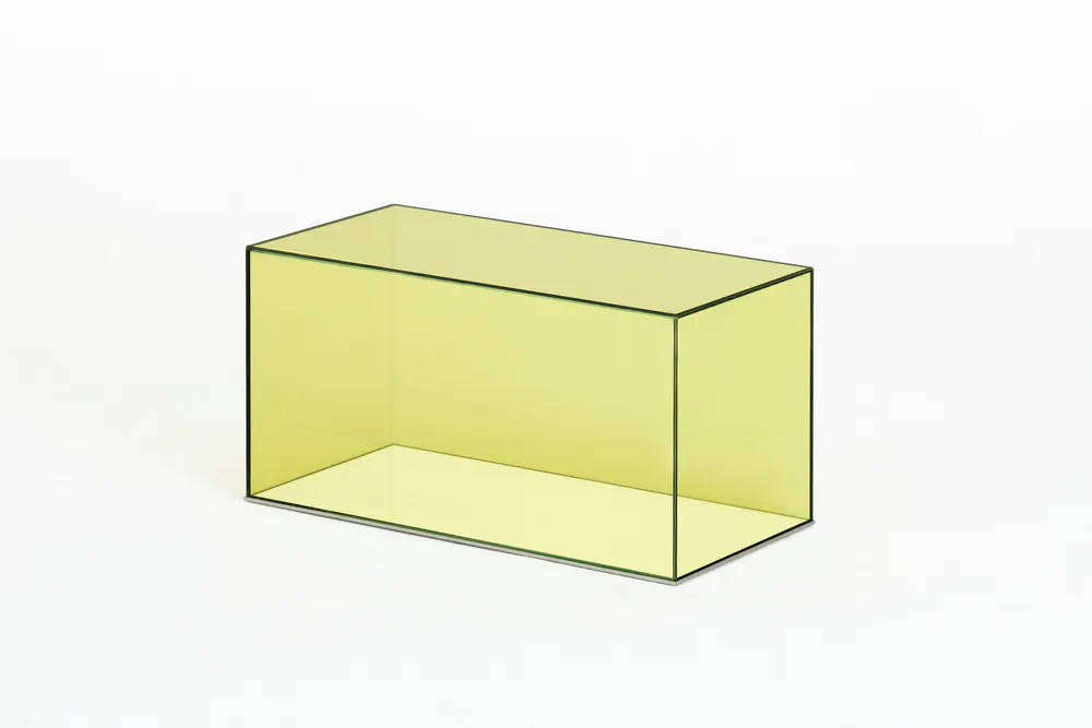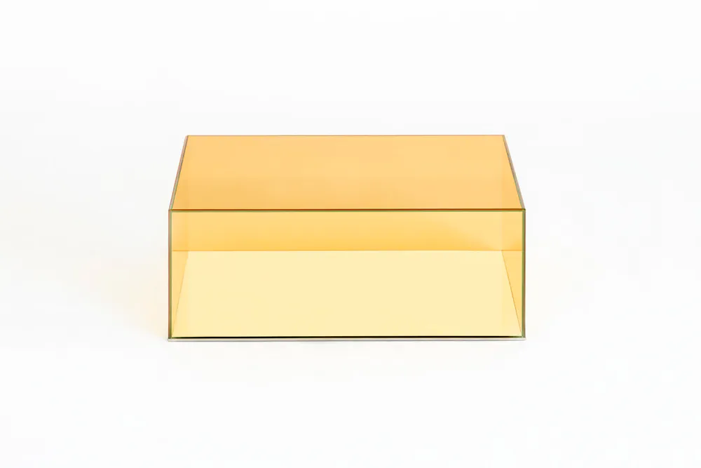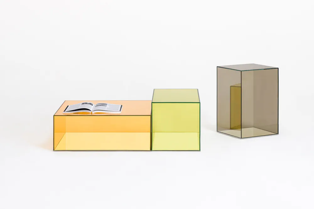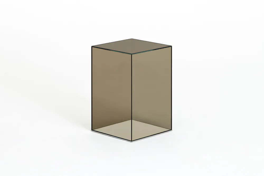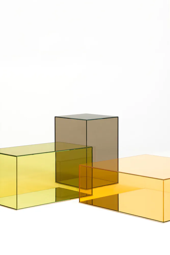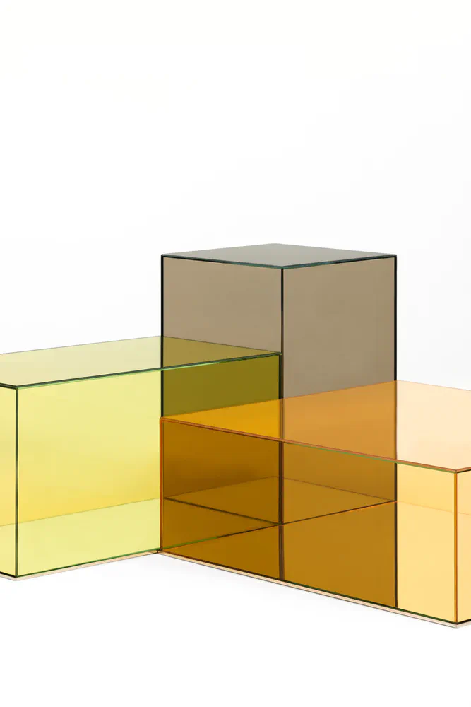 Elevate your space with the Donald low crystal coffee table, a stunning piece crafted from laminated glass in various transparent colors. Its unique parallelepiped design allows for versatile arrangements, whether used individually or combined for larger compositions. The mirrored base, protected by a sleek 'supersilver' stainless steel profile, adds an element of sophistication while ensuring durability. Perfect for modern homes, this coffee table is not just a furniture item; it's a statement piece that enhances any living area with style and contemporary flair.