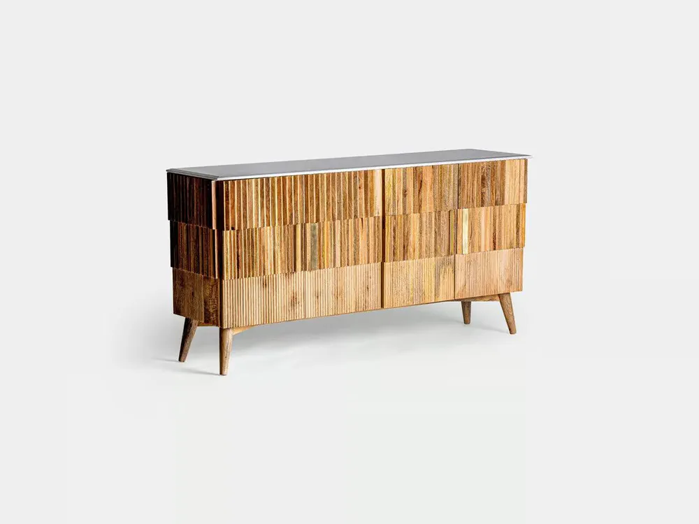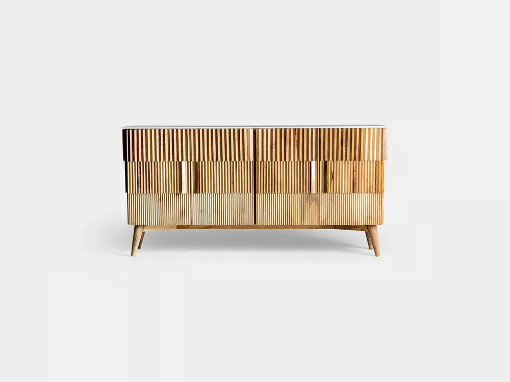 Discover the exquisite Plissé Wood sideboard, a perfect blend of mango wood and elegant marble. Its unique pleated geometric patterns make it a striking addition to any contemporary space. Designed by José Manuel Ferrero, this handcrafted piece not only offers ample storage but also serves as a stunning focal point. Experience the beauty of natural materials and the artistry of Vical Design, inspired by timeless craftsmanship and innovative design. Elevate your living space with this harmonious union of form and function!