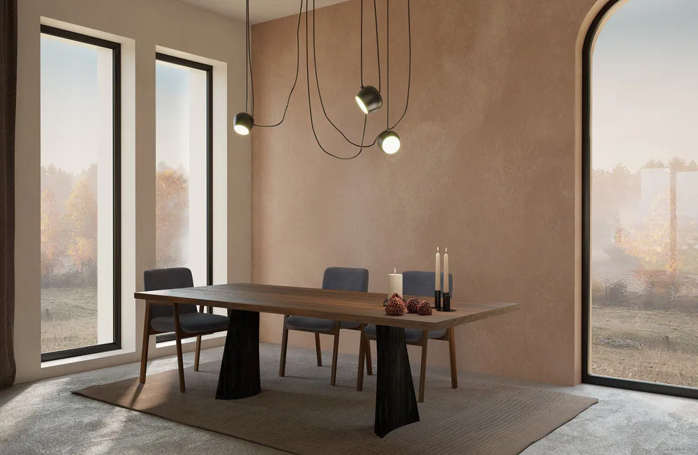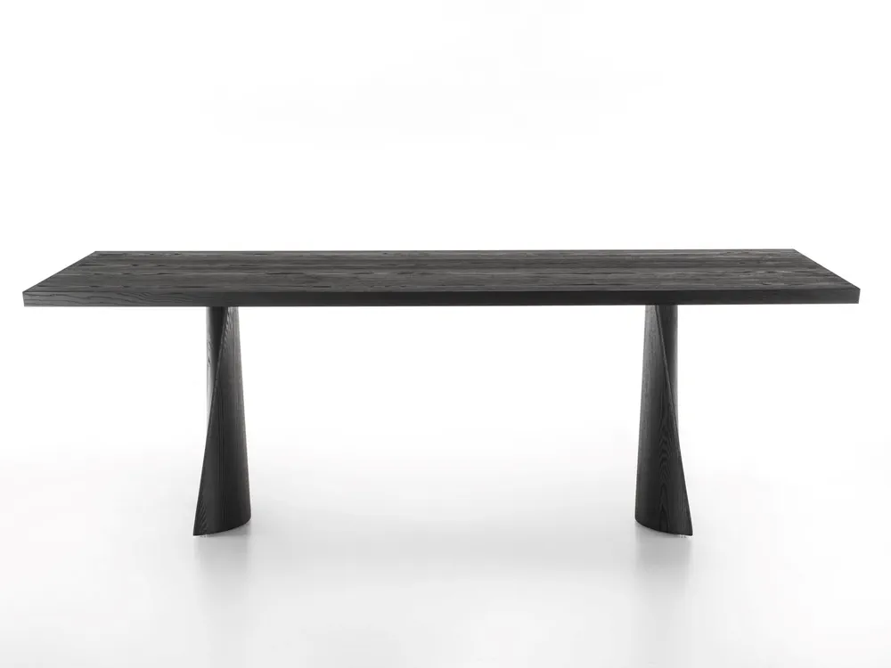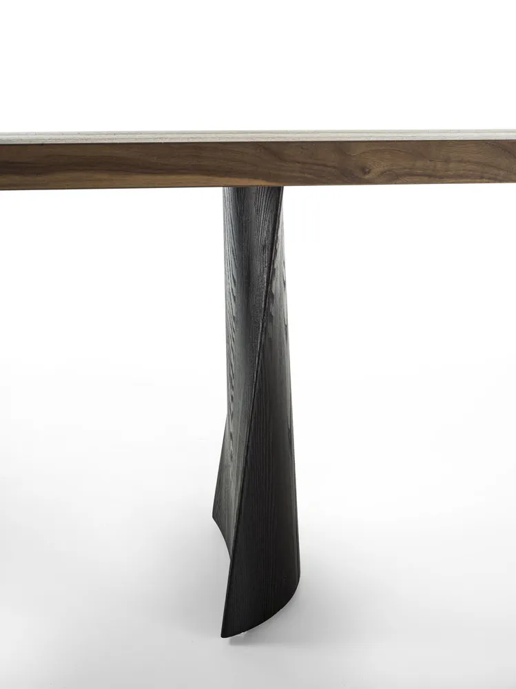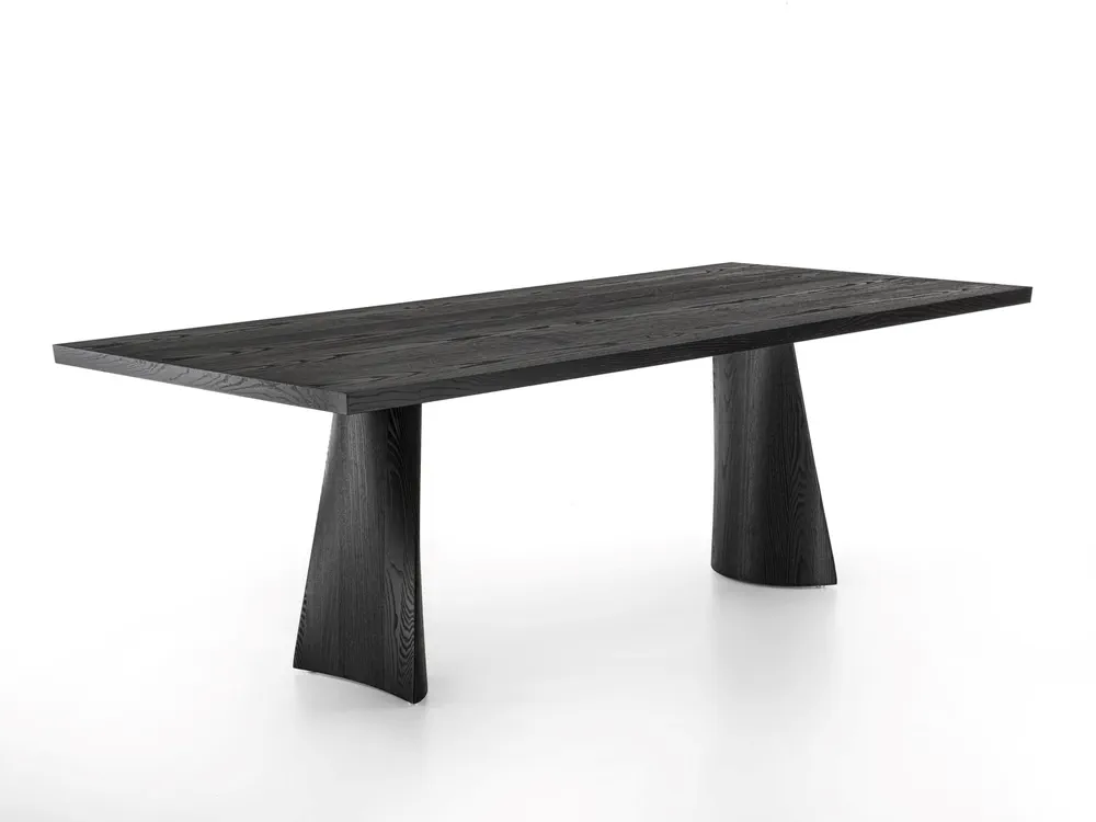 The Simple Swing dining table beautifully combines style and function with its blockboard veneered top and elegant bevelled edges. Supported by two solid wood legs with a pigmented finish, its unique base design features a captivating interplay of curves and straight lines, adding a sense of lightness to any dining space. This versatile wooden dining table is perfect for both formal and casual settings. Enhance your home with a piece that reflects authentic design and impeccable craftsmanship.