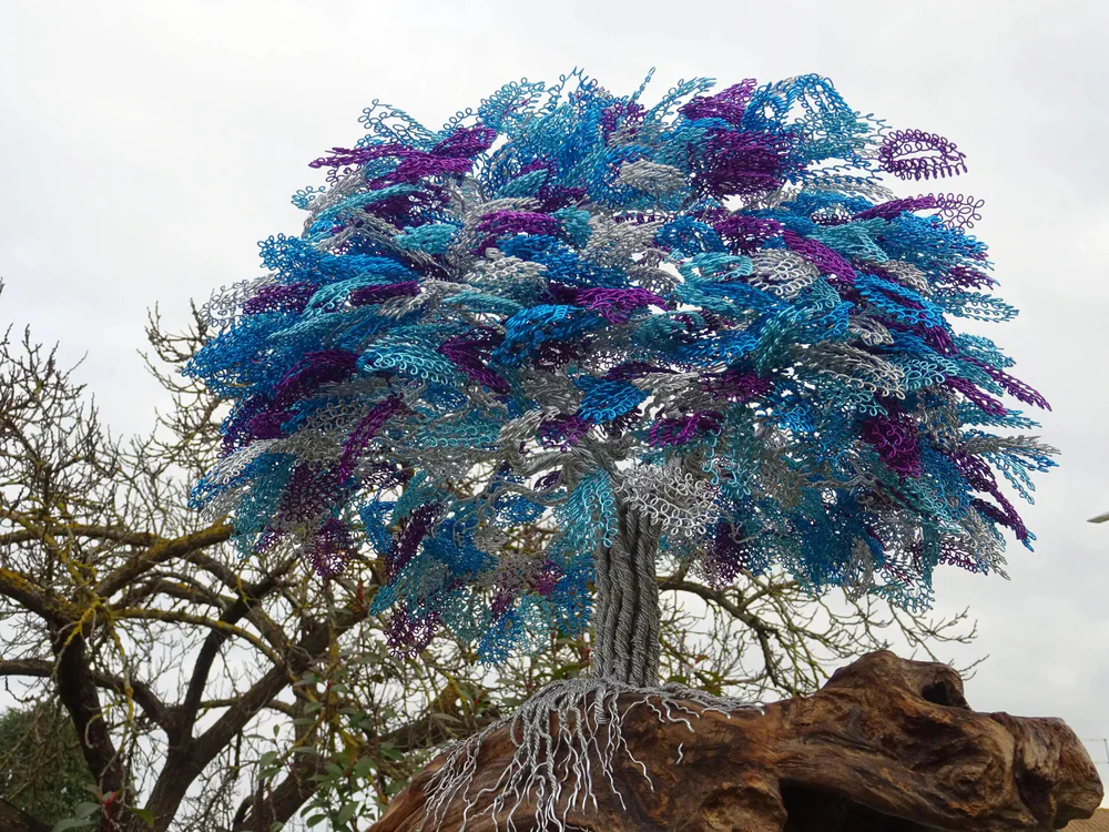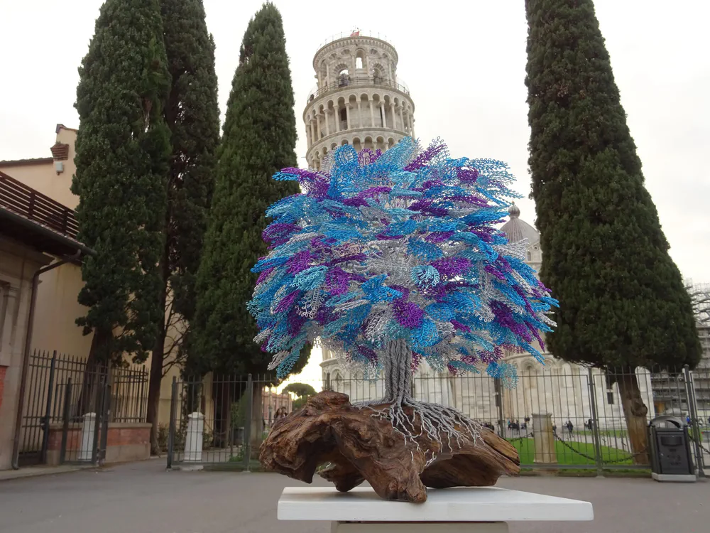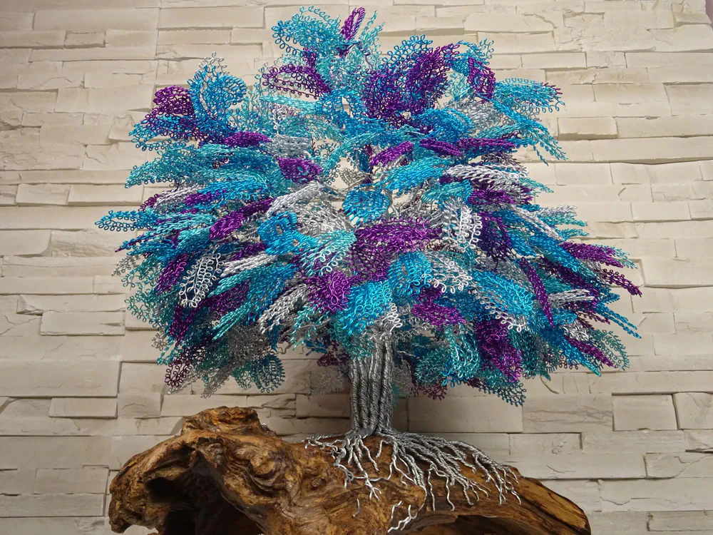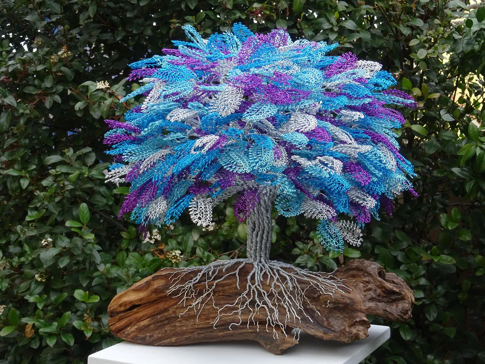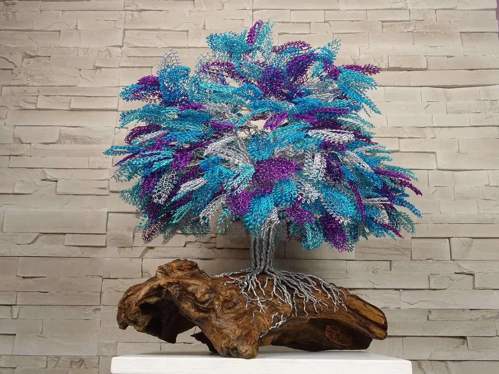 Discover the exquisite BLUE JACARANDA, a handmade bonsai sculpture crafted from aluminum and olive wood. This stunning piece embodies a naturalistic scenario, representing a tree's lifecycle through intertwined, hand-braided wires. Each sculpture is uniquely anchored to a treated wood base, ensuring that the touch and aromas reflect nature's essence. Inspired by the Tuscan hills, this art piece not only beautifies your space but also serves as a celebration of life and nature. Elevate your decor with this distinct and captivating artwork that showcases craftsmanship and creativity.