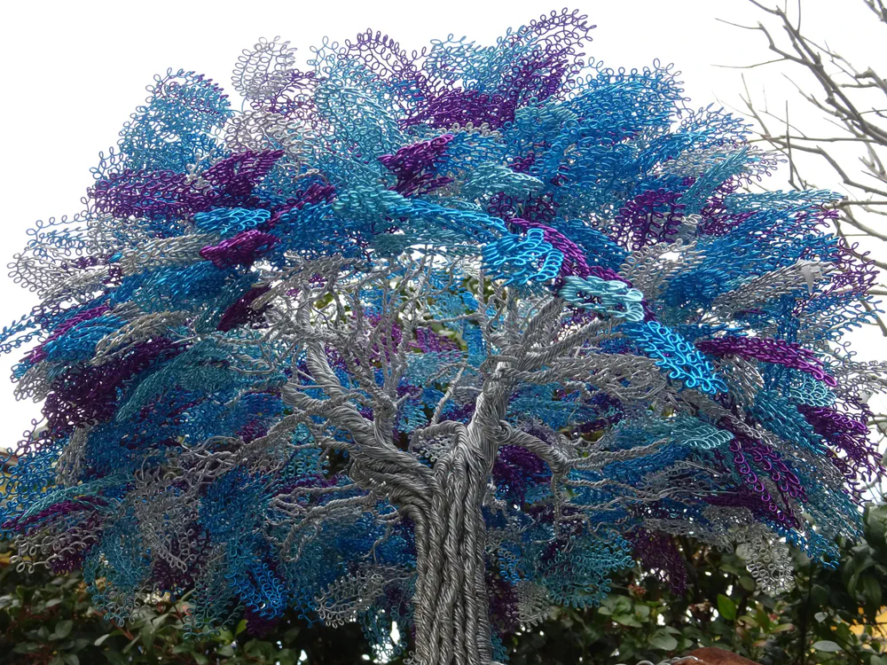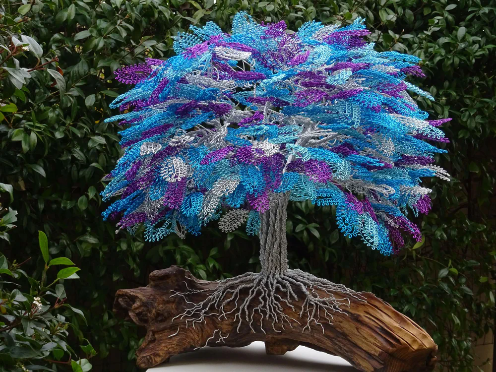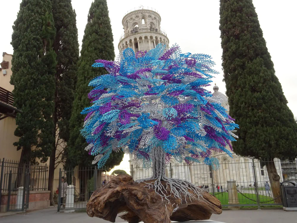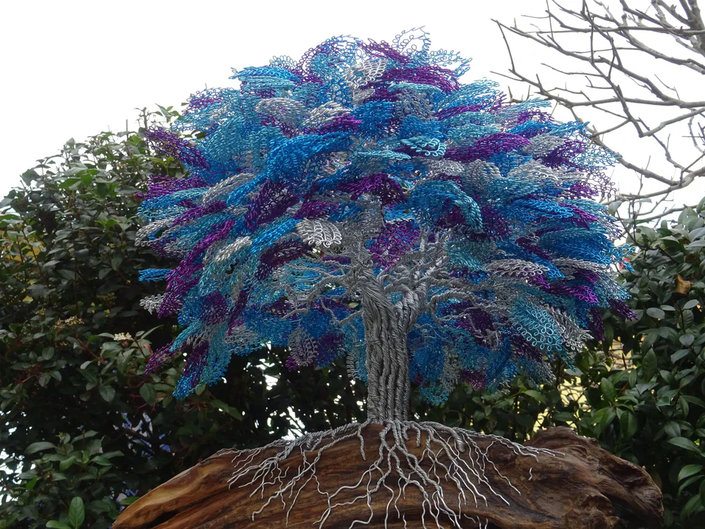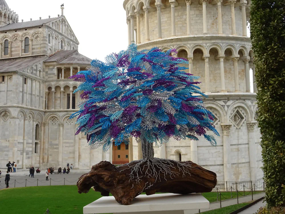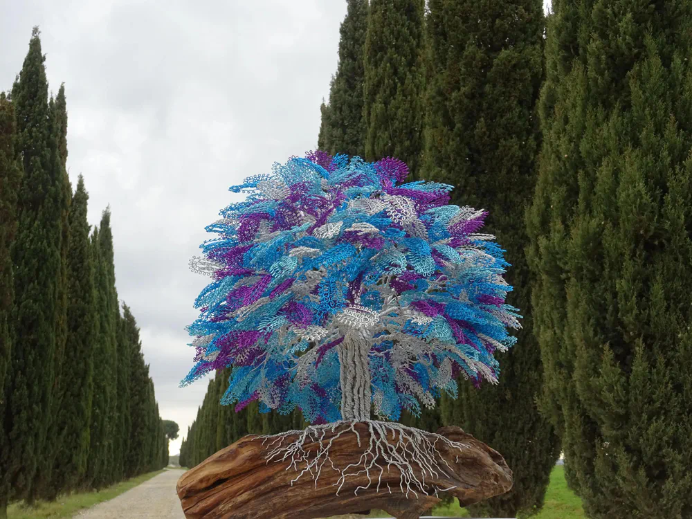 Discover the exquisite BLUE JACARANDA, a handmade bonsai sculpture crafted from aluminum and olive wood. This stunning piece embodies a naturalistic scenario, representing a tree's lifecycle through intertwined, hand-braided wires. Each sculpture is uniquely anchored to a treated wood base, ensuring that the touch and aromas reflect nature's essence. Inspired by the Tuscan hills, this art piece not only beautifies your space but also serves as a celebration of life and nature. Elevate your decor with this distinct and captivating artwork that showcases craftsmanship and creativity.