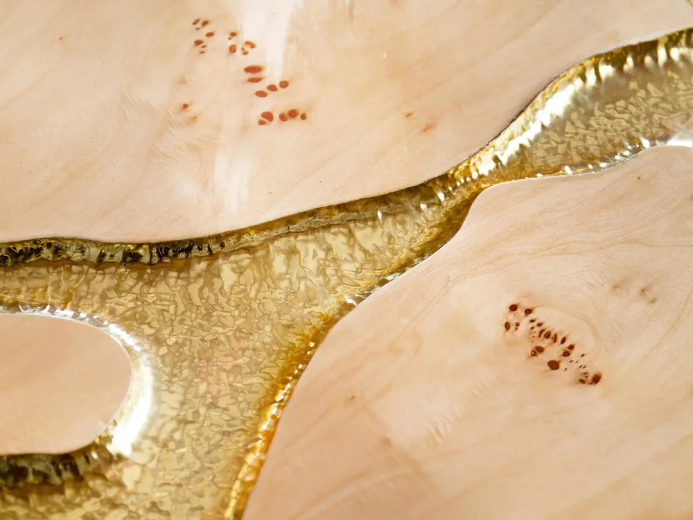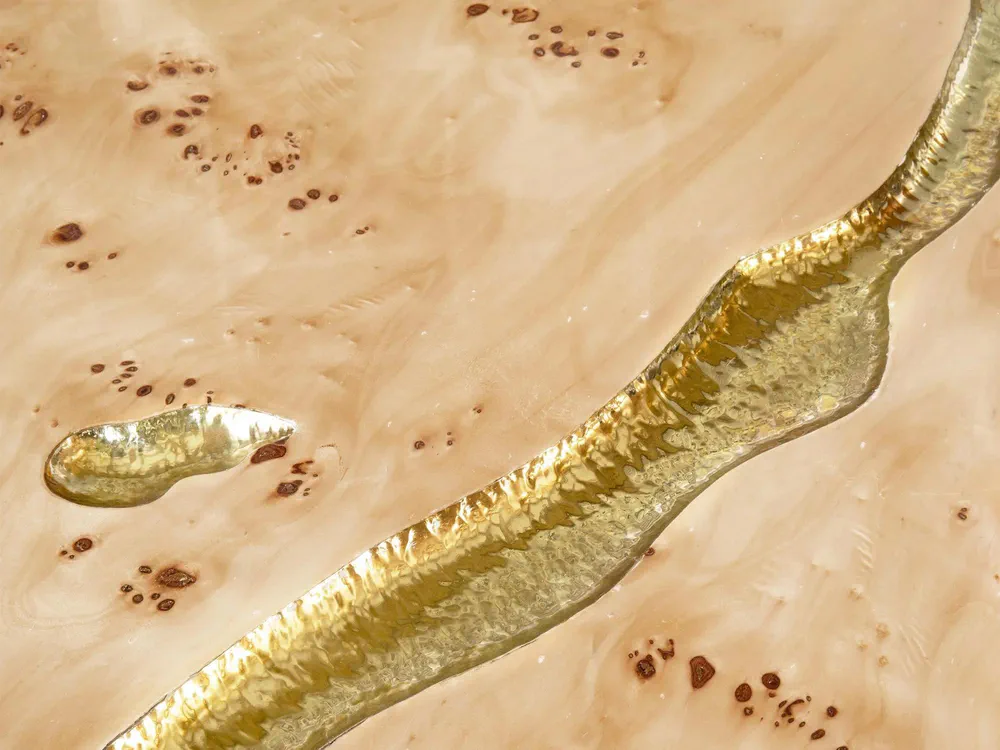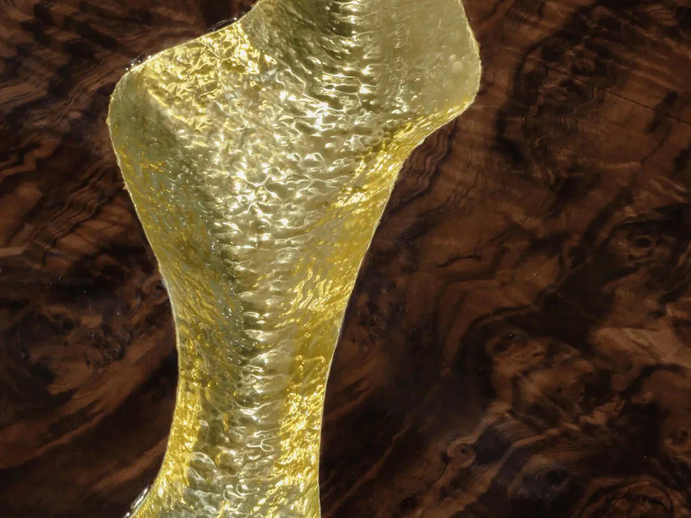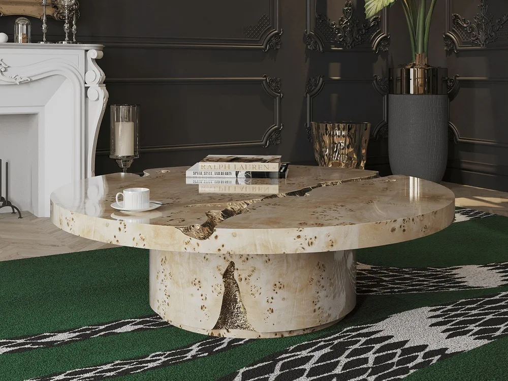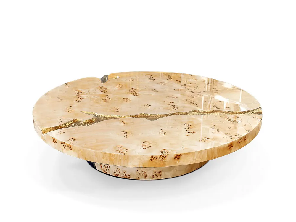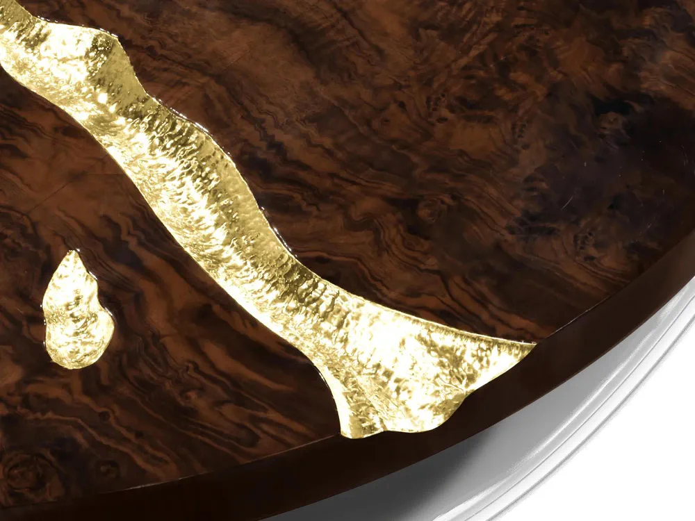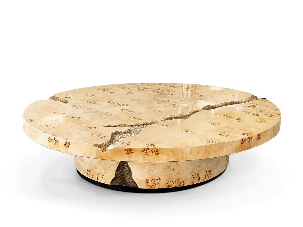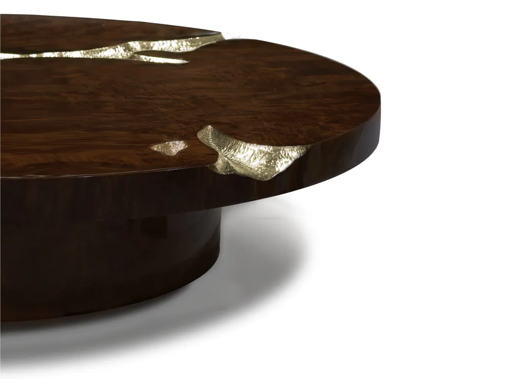 Elevate your living space with the stunning EMPIRE round coffee table. This limited edition masterpiece features a unique blend of mahogany wood and polished brass, crafted through exquisite wood carving and metal works. Each table showcases hand-carved cracks, creating an organic finish that reflects elegance and sophistication. With custom sizes and colors available, the EMPIRE table is perfect for those seeking a bespoke furniture solution. Make a bold statement with this contemporary piece designed to impress and enhance your most memorable occasions.